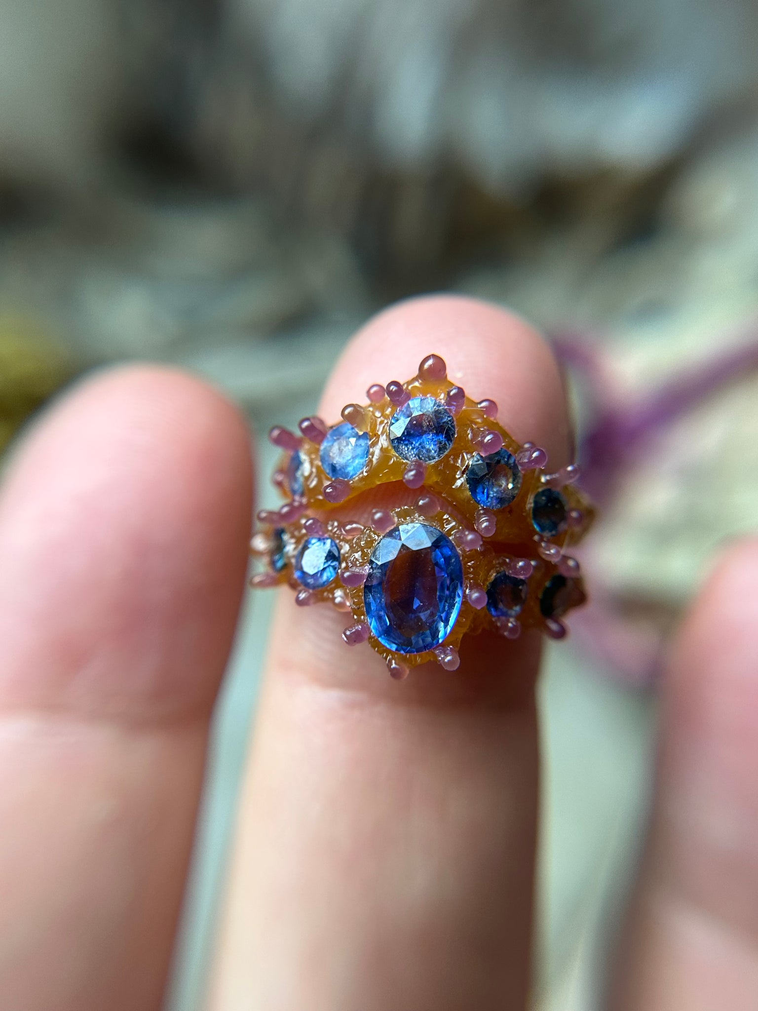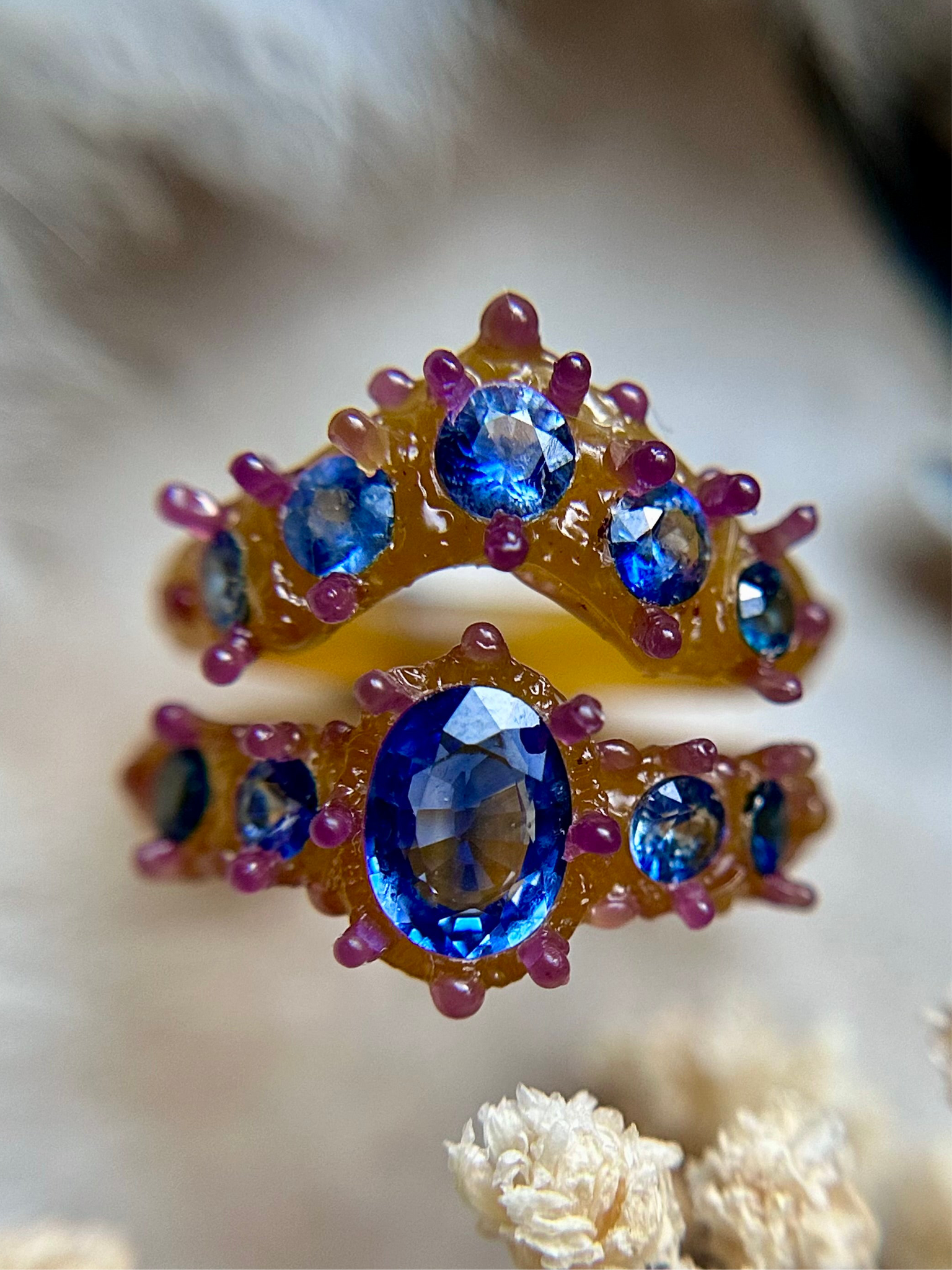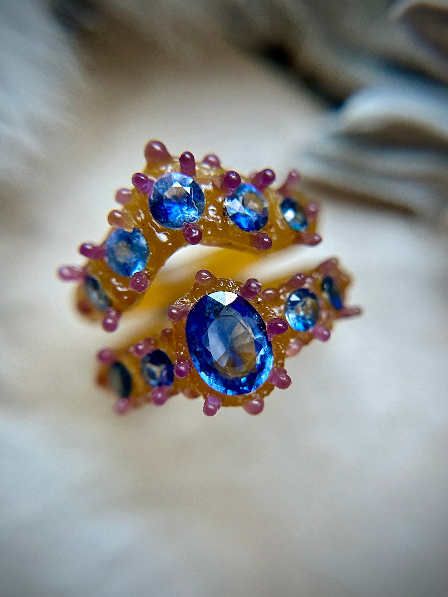Every element of this design — from the sapphire arrangement to the hand-shaped band — carries the warmth and intention of slow, deliberate craftsmanship.