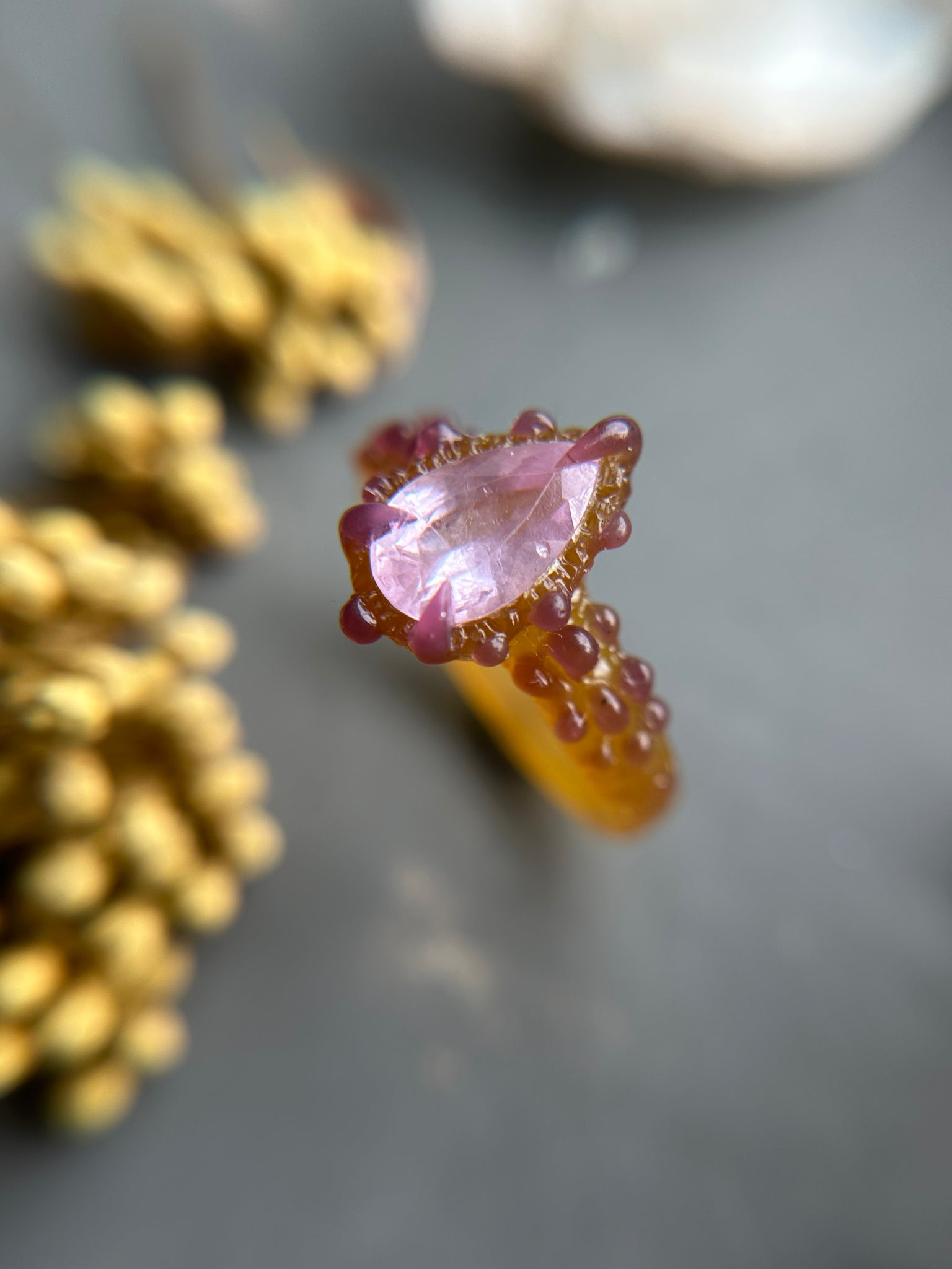 The centerpiece of this ring is a 1.76 carat gemstone, carefully selected for its natural beauty and presence. Its brilliance is elevated by an organic, hand-carved setting that flows around the stone, emphasizing its unique character. The textured band balances elegance with strength, creating a timeless heirloom that feels alive with artistry.