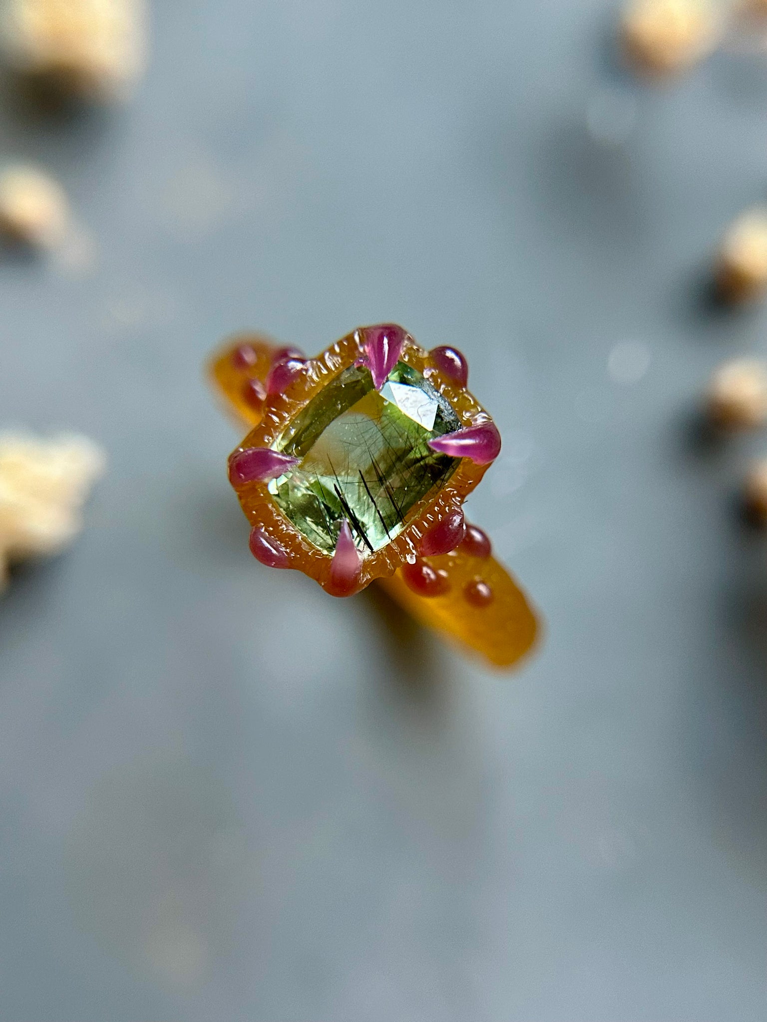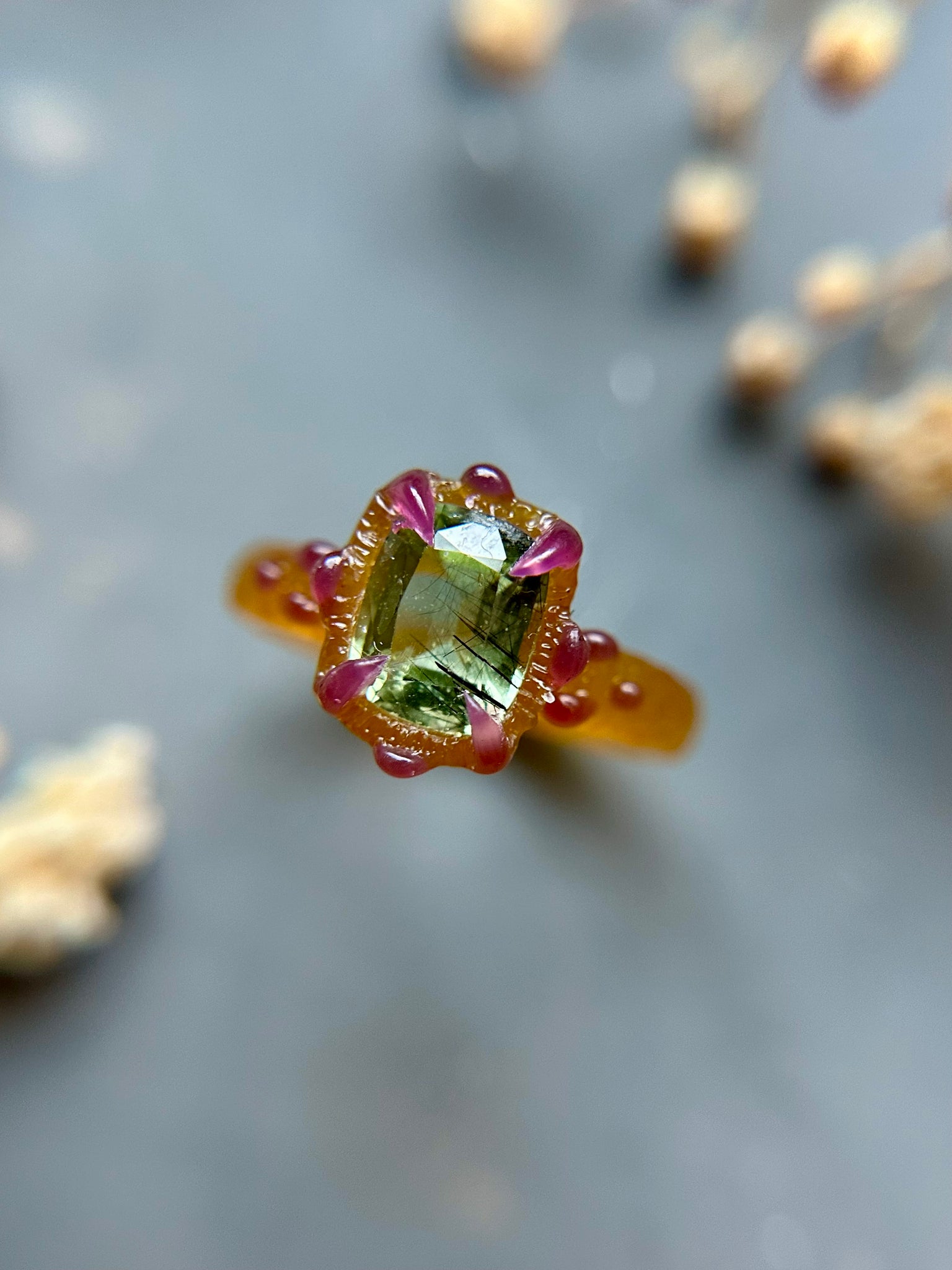 ✨ This ring captures the living light of the Ludwigite Peridot — hand-carved in wax, cast in solid metal, and brought to life through intentional craftsmanship. Each piece is created slowly and purposefully, becoming a true heirloom of earth and artistry.