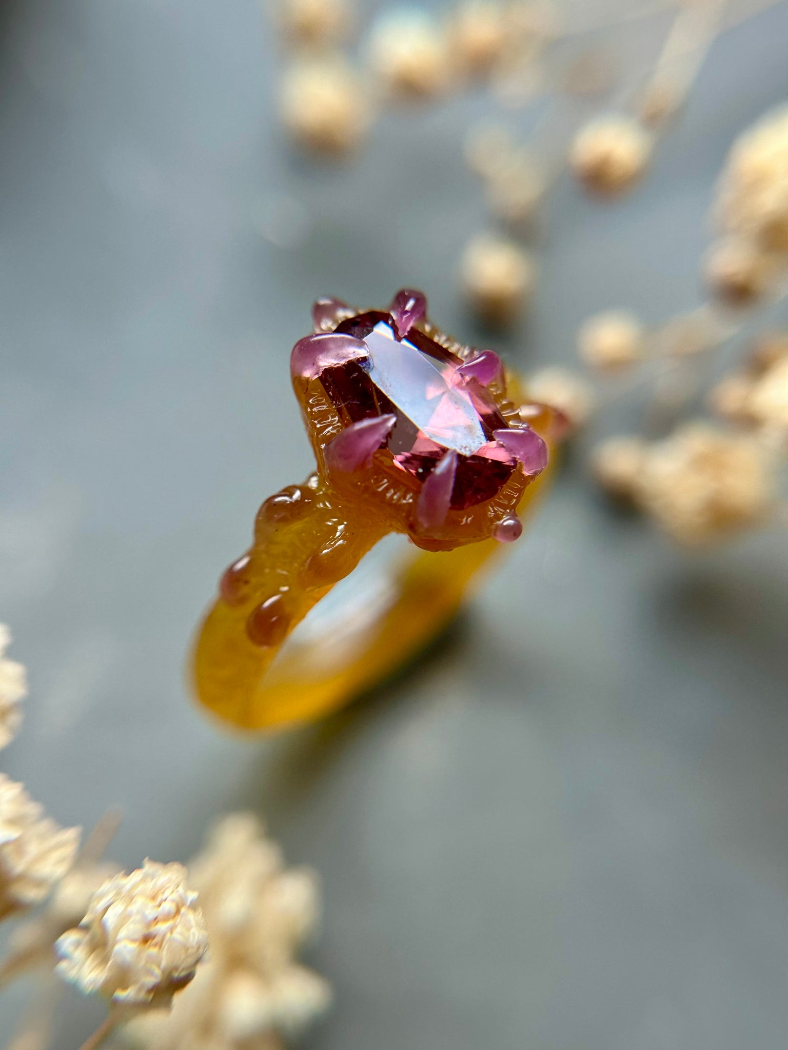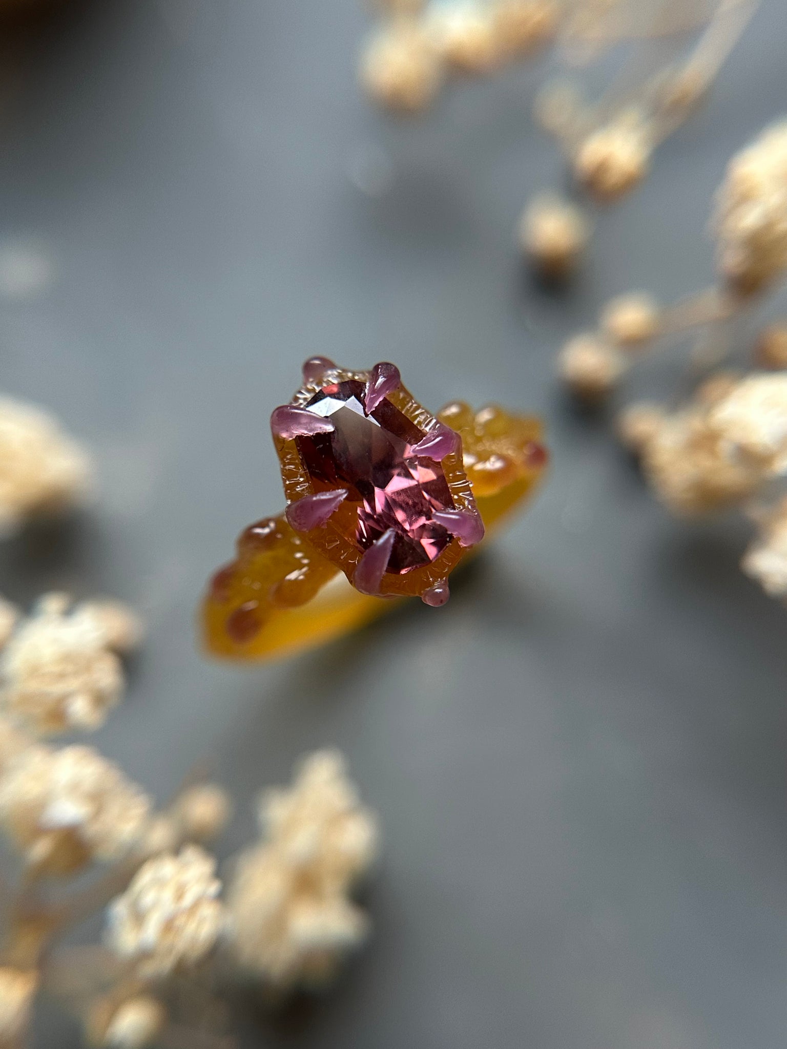 Each ring begins as a hand-carved wax — sculpted slowly and intuitively to complement the stone’s natural shape and depth. Once the wax is completed, it is cast in your chosen metal, preserving every organic texture and mark of the carving process. The final result is an heirloom-quality piece that feels ancient, powerful, and alive.