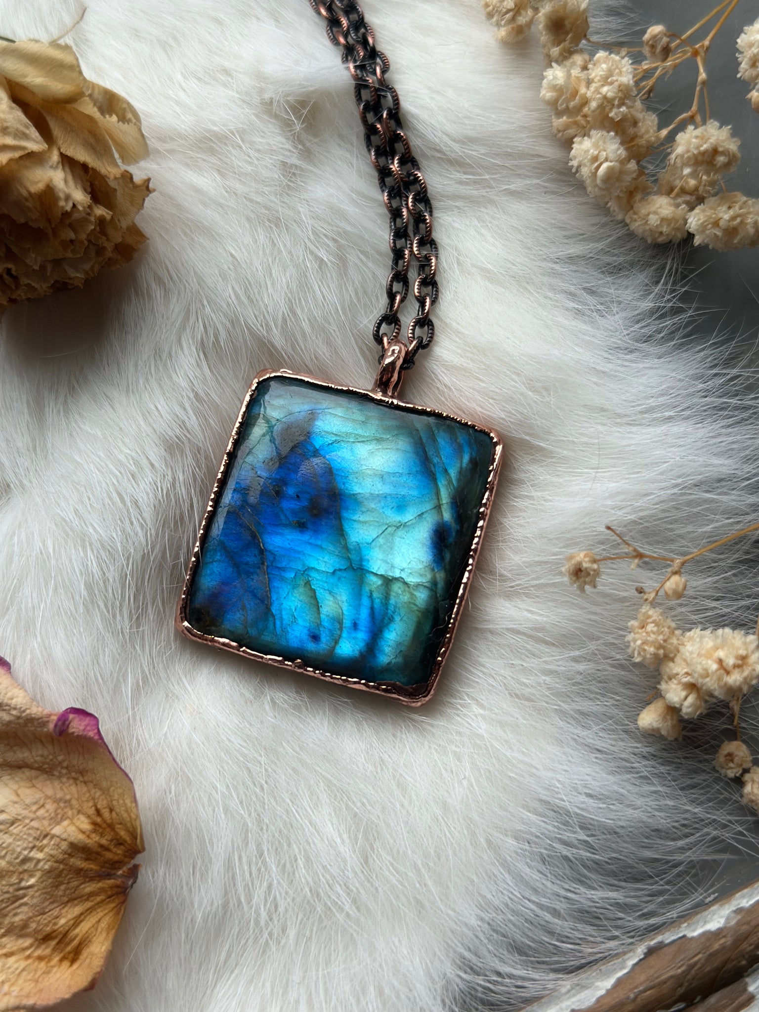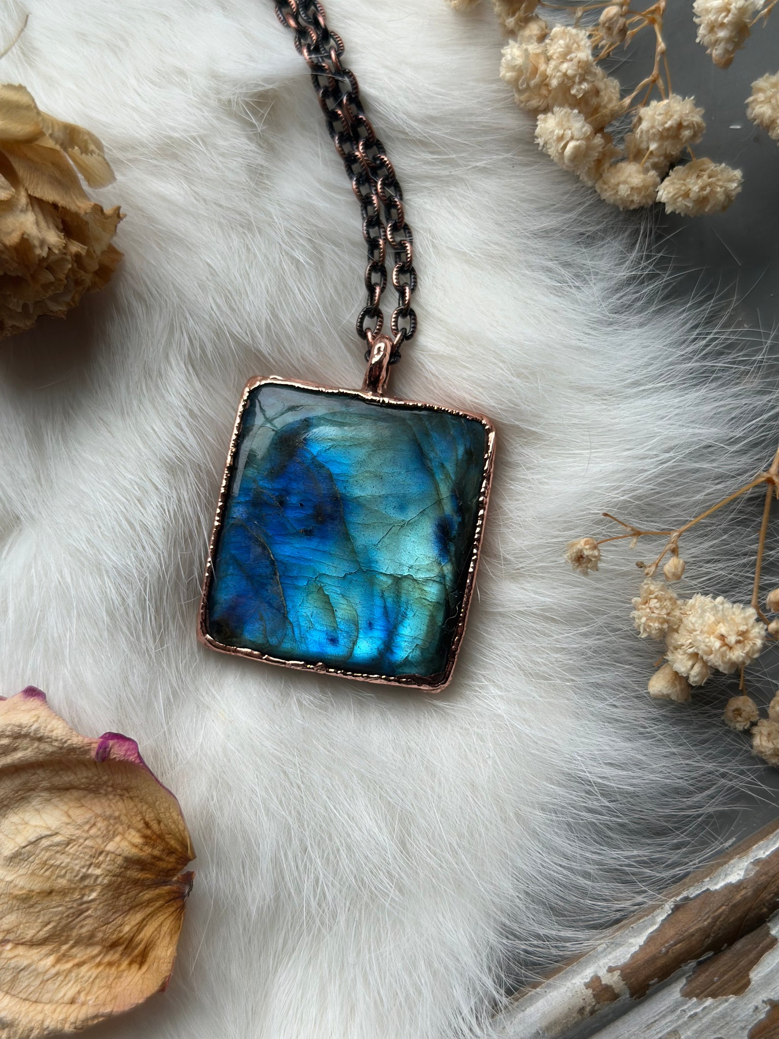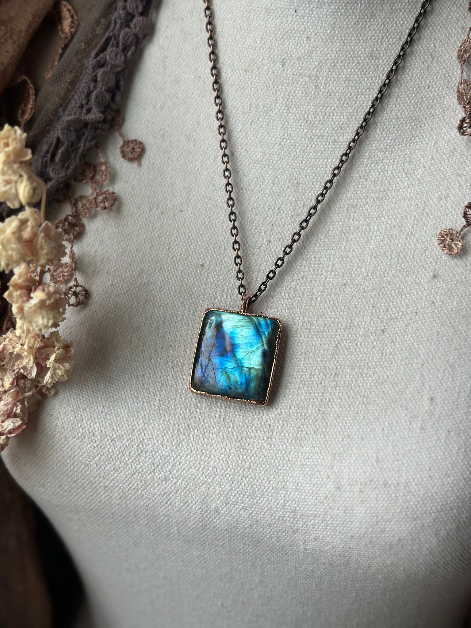 This enchanting necklace features a luminous Labradorite pendant, known for its magical flashes of blue, green, and gold that dance in the light. Set in warm copper, the pendant beautifully complements the stone’s natural iridescence, creating a piece that feels both mystical and grounding.