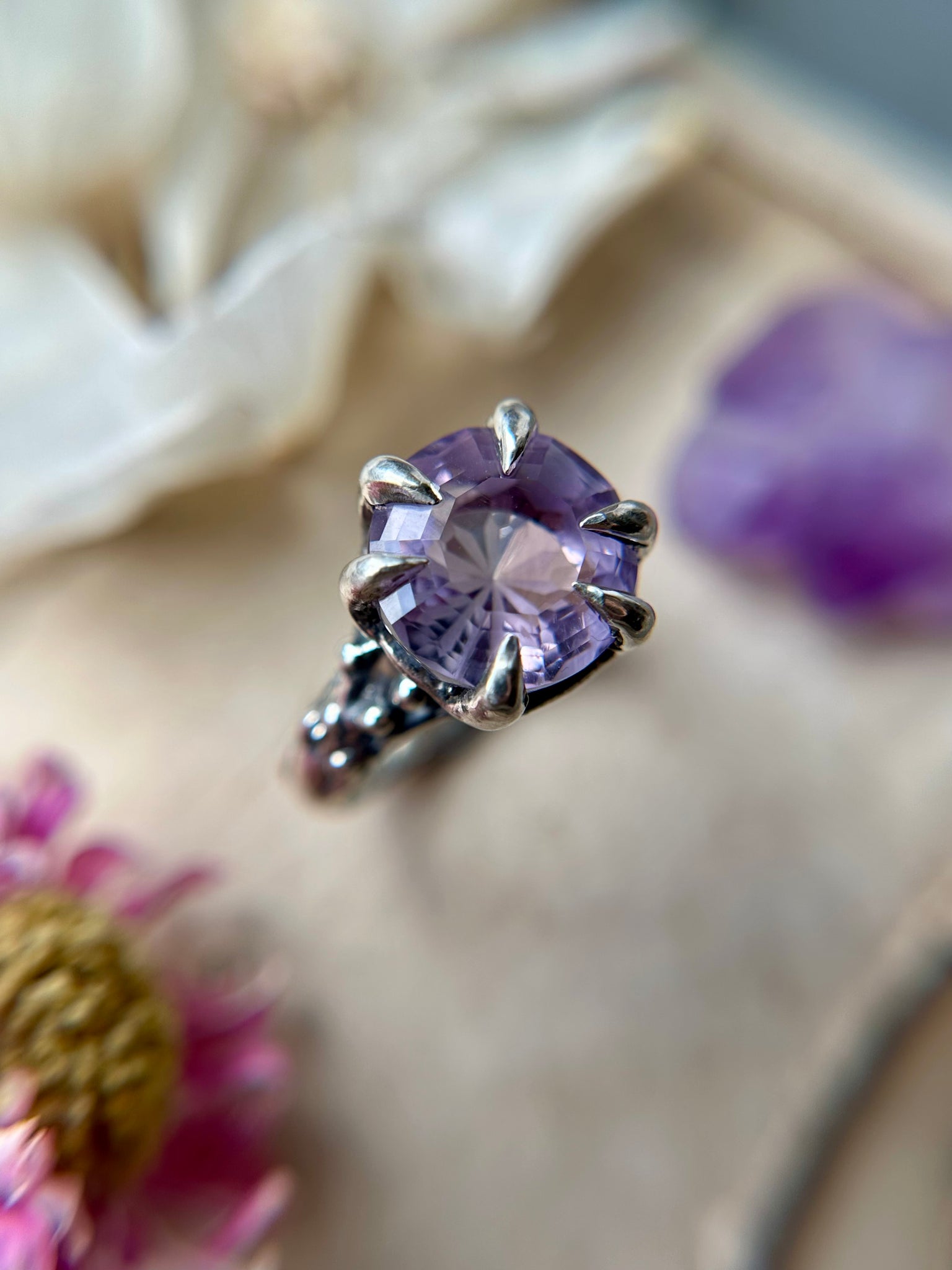 The pendant showcases the natural beauty of the amethyst, framed by organic textures that highlight its depth and color. The accompanying ring, crafted to a size 8, carries the same artisanal touch—balanced between elegance and strength, making it perfect for daily wear or as a meaningful heirloom.