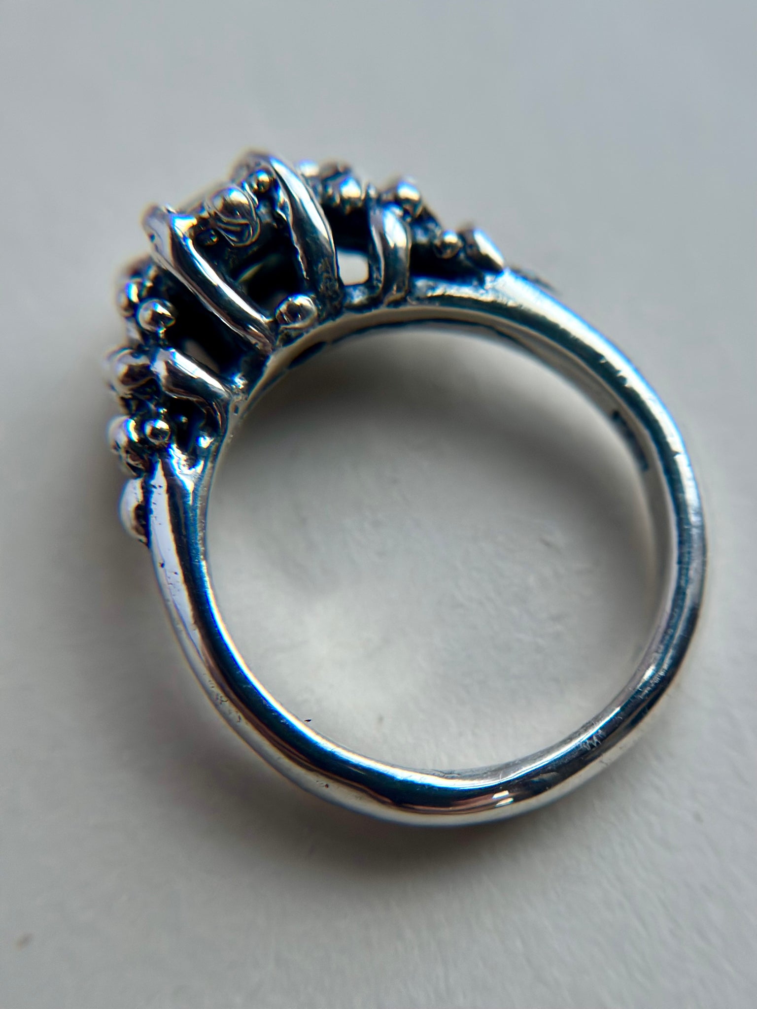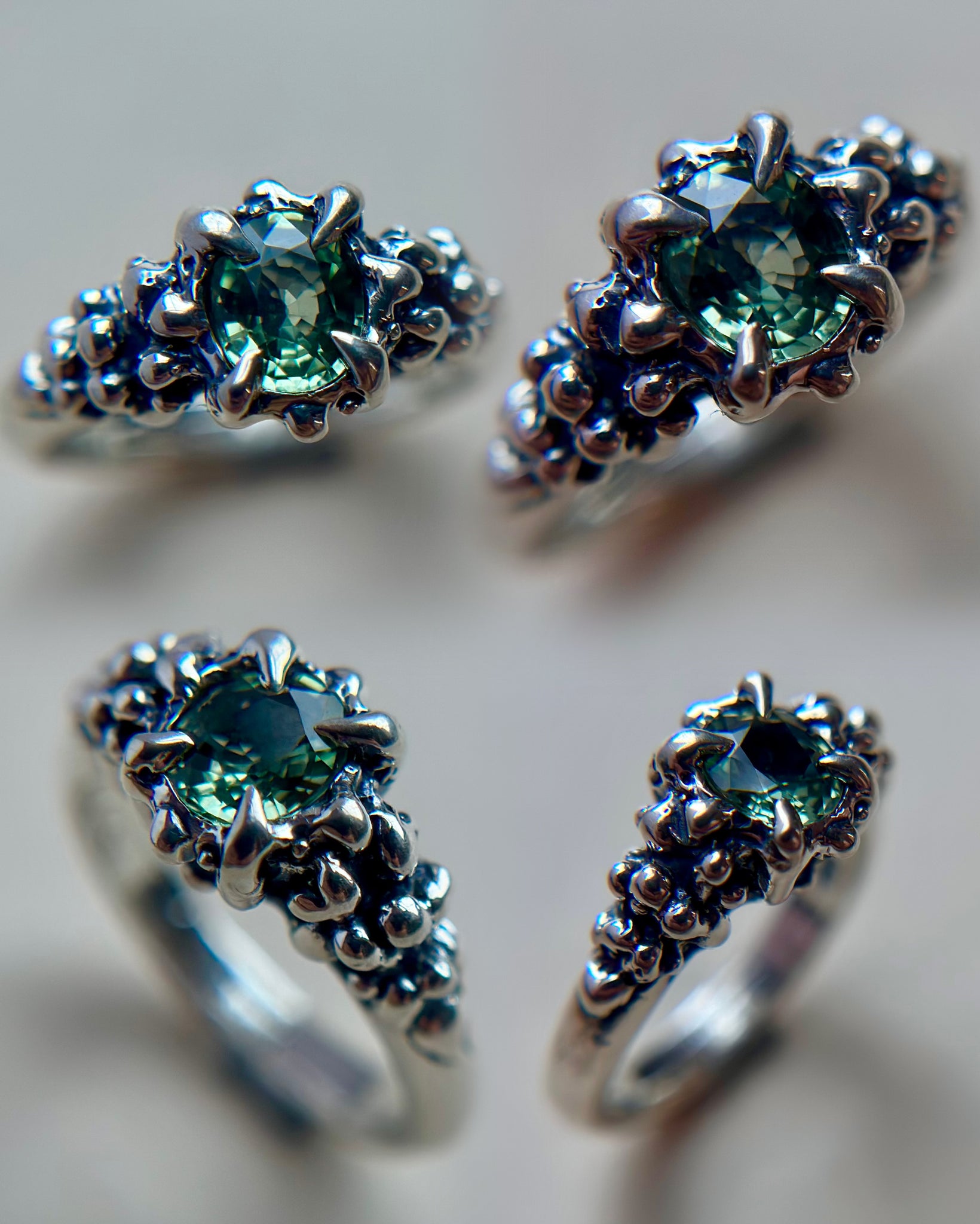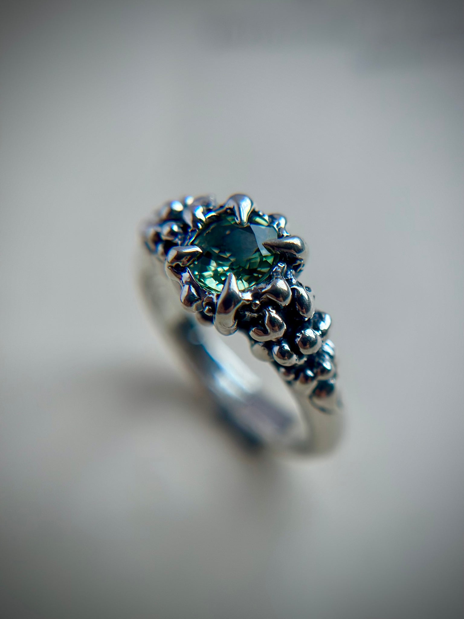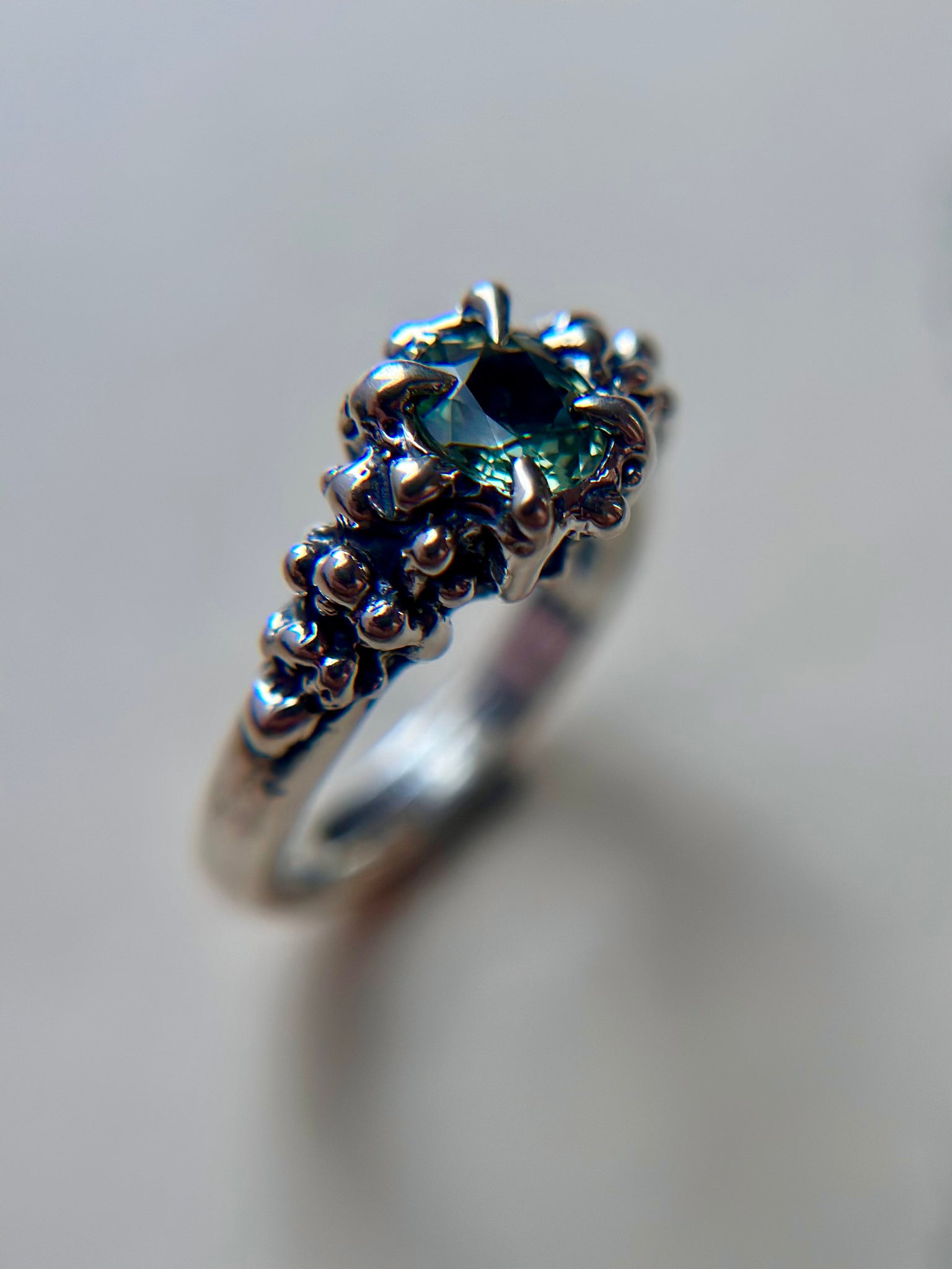 Each piece is entirely unique, with subtle variations that come from the hand-carved process, making this ring truly one-of-a-kind. The cool sheen of sterling silver pairs beautifully with the rich hues of Madagascar Sapphire, creating a timeless heirloom that feels both modern and ancient.