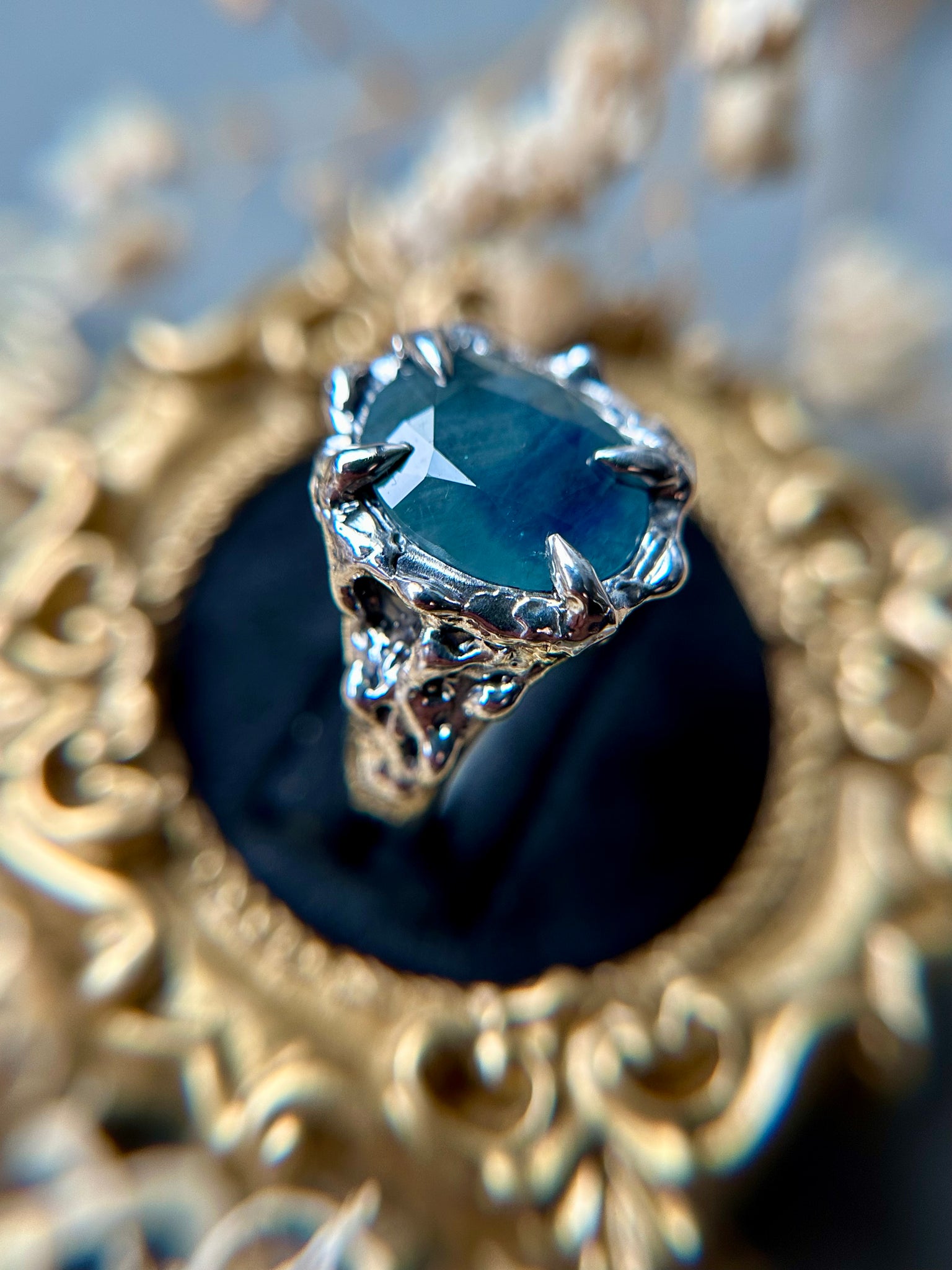 This striking ring features a genuine blue sapphire set in solid sterling silver. Each piece begins as a hand-carved wax model, created using the ancient lost wax casting technique and cast right here in my home studio. The process gives the ring its organic texture and one-of-a-kind character. Once cast, the sapphire is carefully set by my husband, completing a truly collaborative, handcrafted piece.