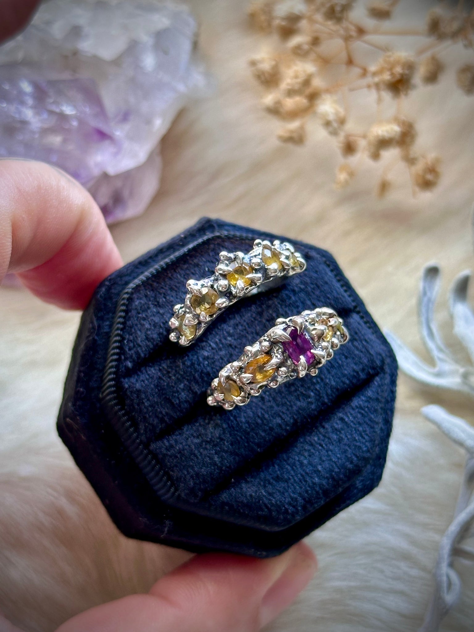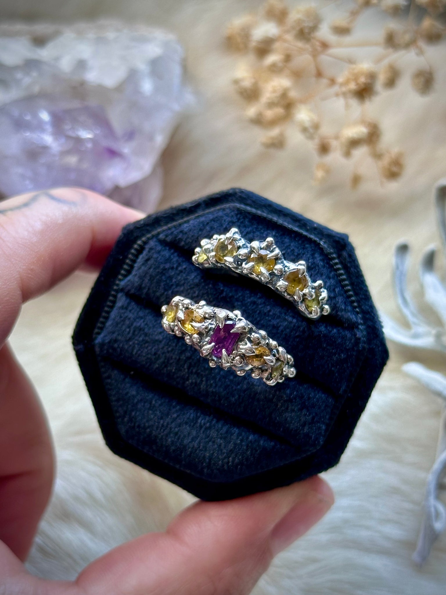 Handcrafted in my studio using the ancient lost wax casting technique, this sterling silver ring carries both artistry and tradition. The design features a stunning center stone — a beautifully cut pink cashmere sapphire — radiating soft, romantic color. Flanking the centerpiece on each side are two vibrant yellow sapphires, for a total of four, adding a sunny, golden contrast. This size 7 ring blends timeless craftsmanship with a vibrant, modern palette, making it a truly one-of-a-kind piece.
