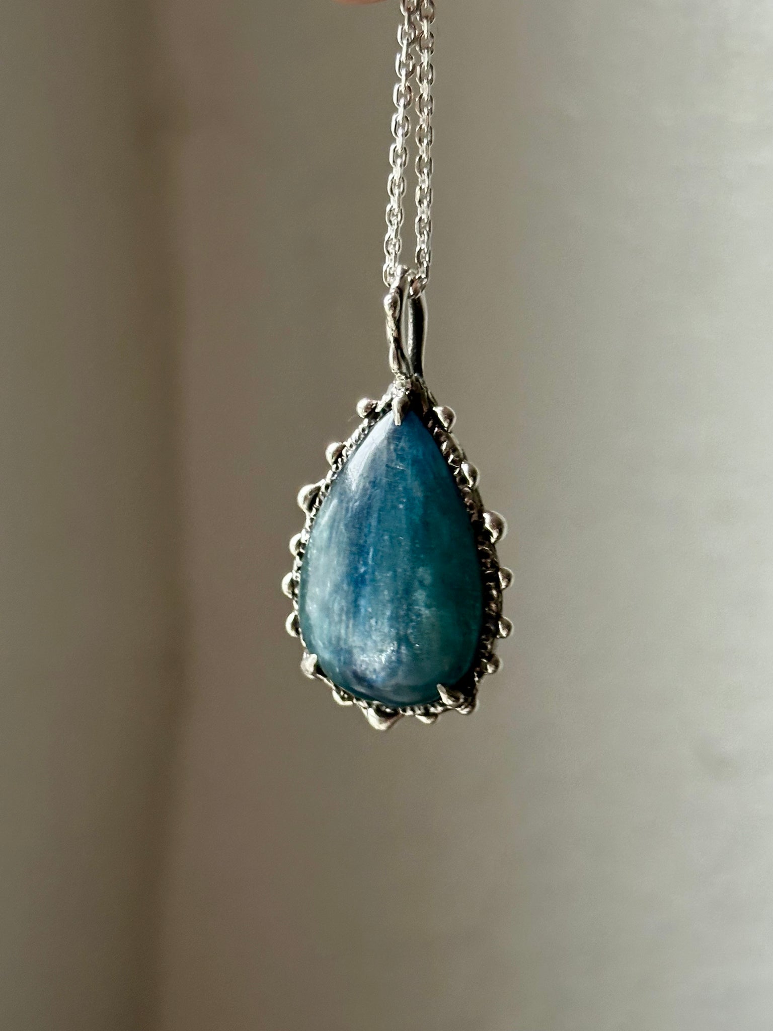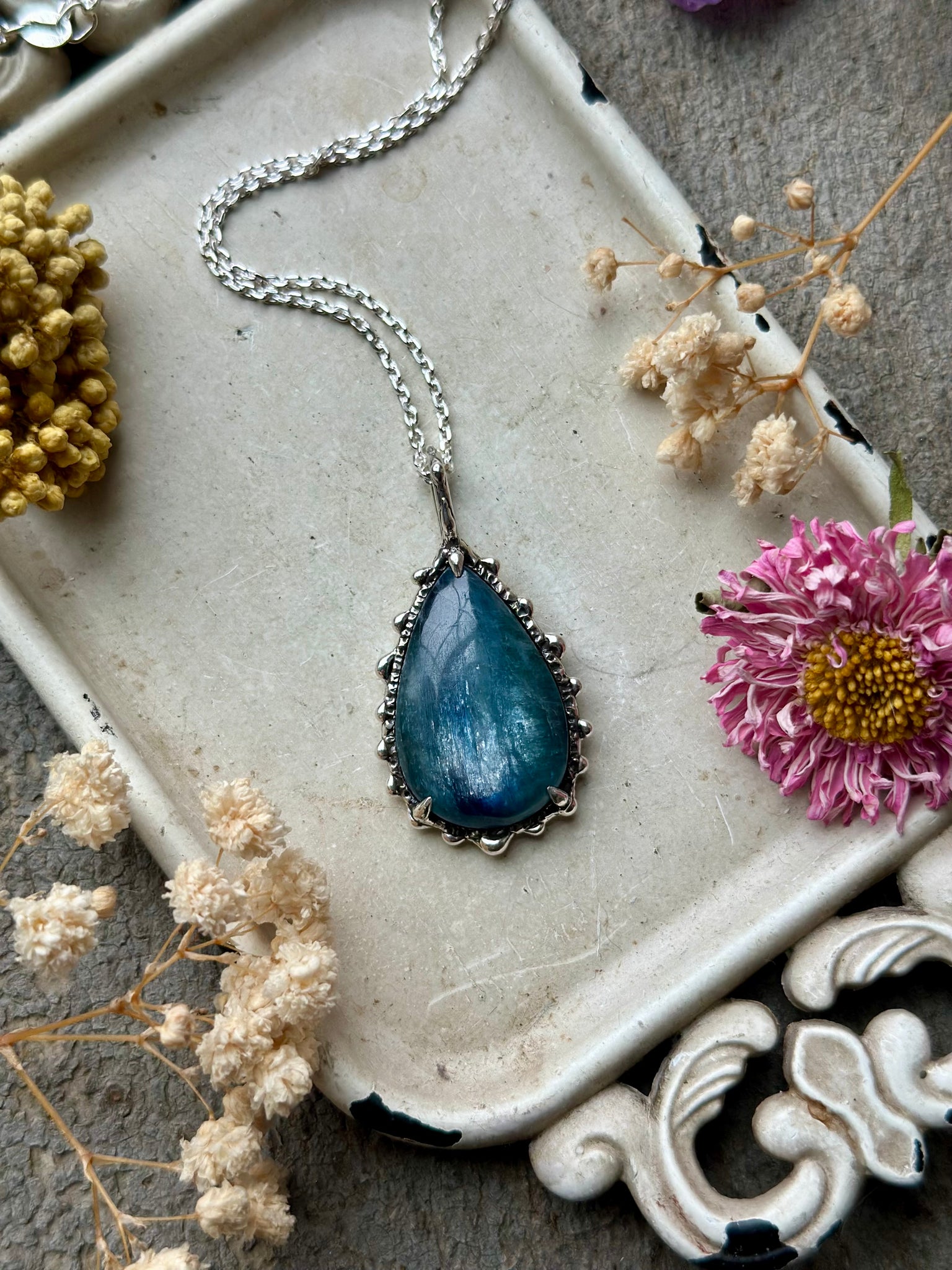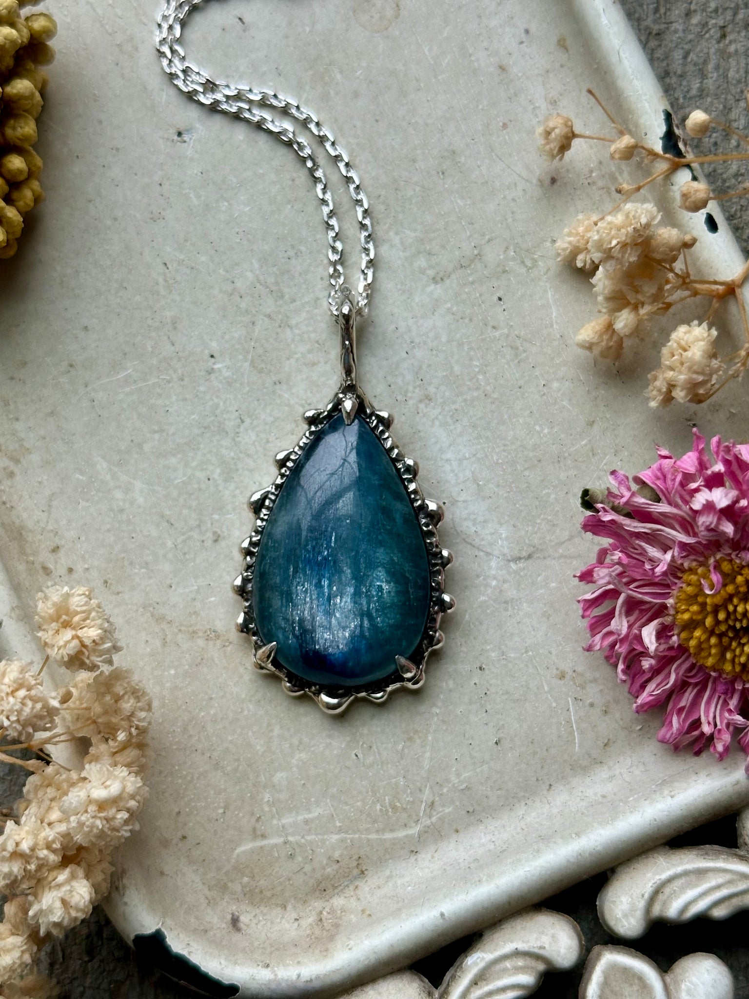 Elevate your everyday style with this sterling silver blue kyanite necklace, featuring a hand-carved pendant that brings a touch of artistry to any look. The pendant measures 1.75 inches long, sculpted in solid sterling silver to cradle a sleek strip of natural blue kyanite, known for its calming, deep ocean hue. It hangs from an 18-inch sterling silver chain, creating the perfect balance of elegance and wearability.