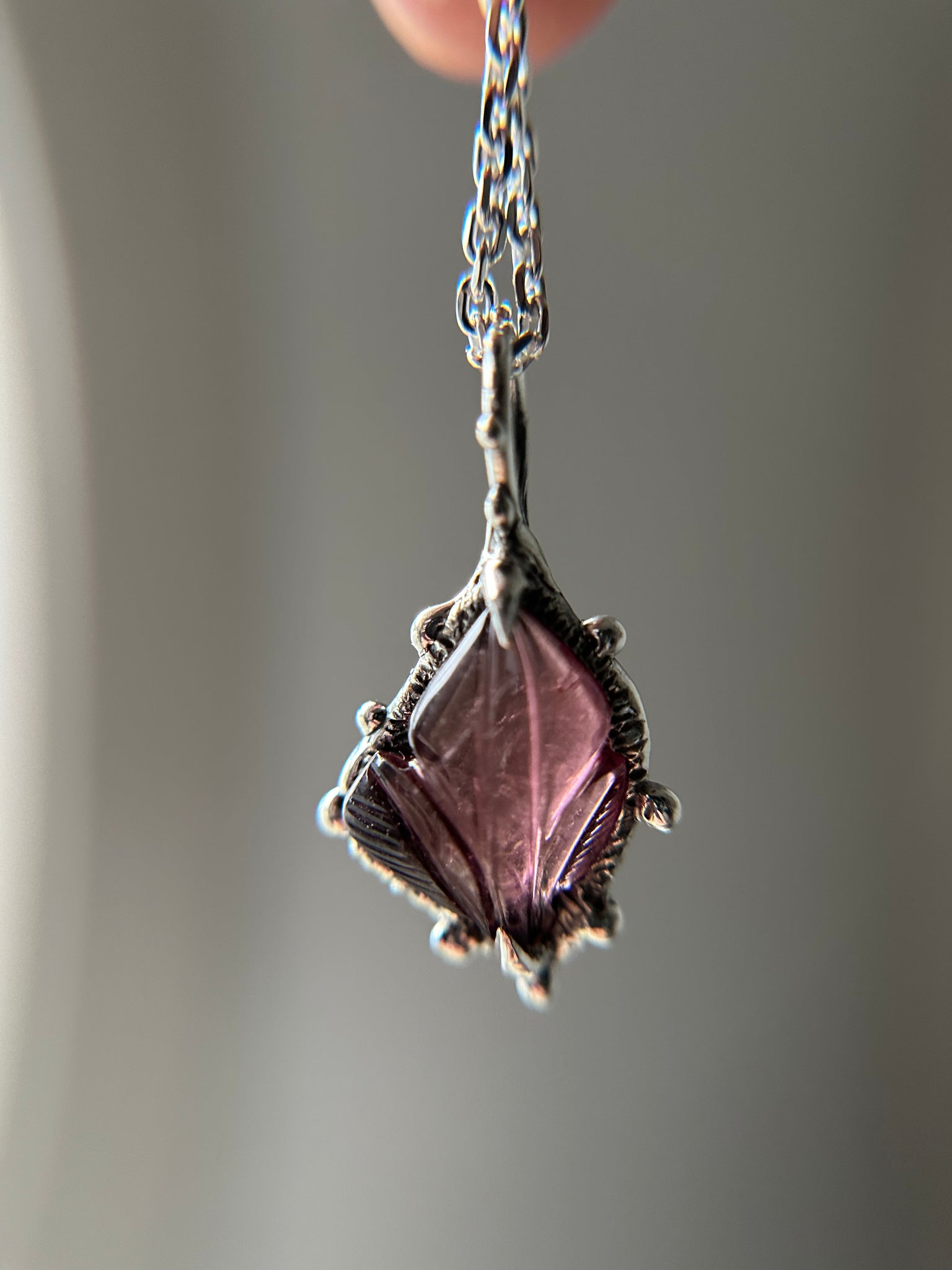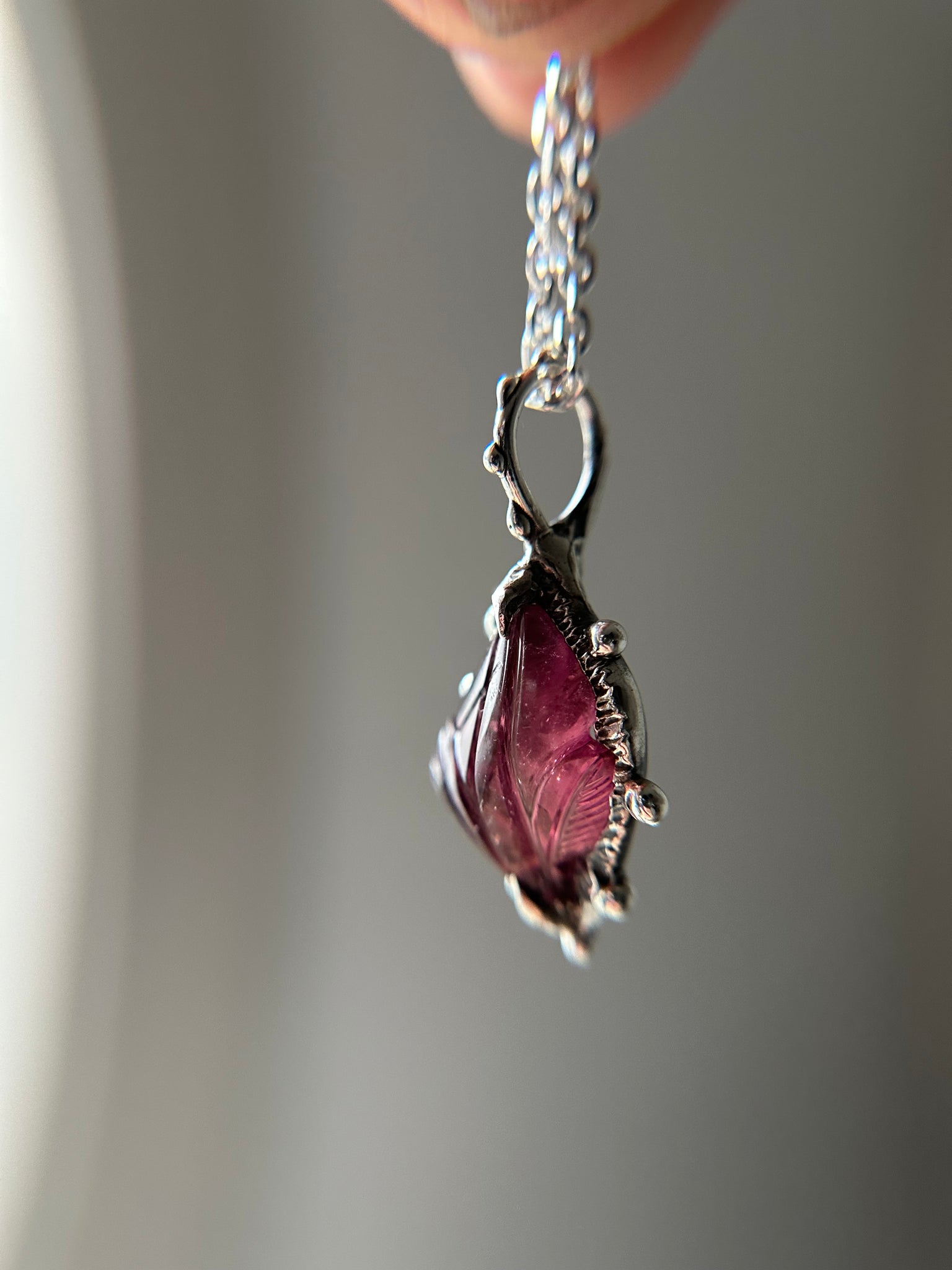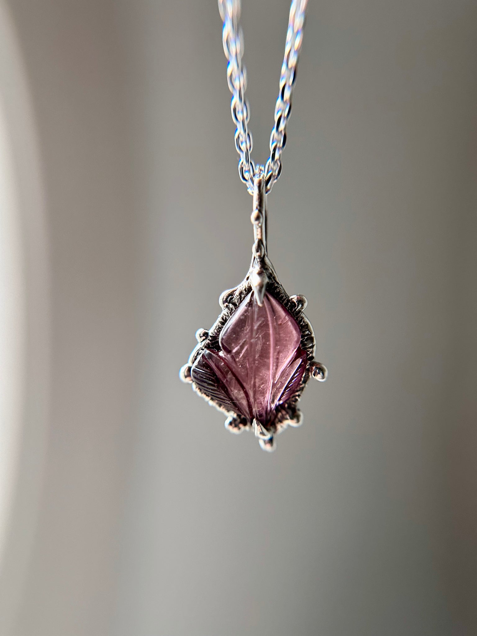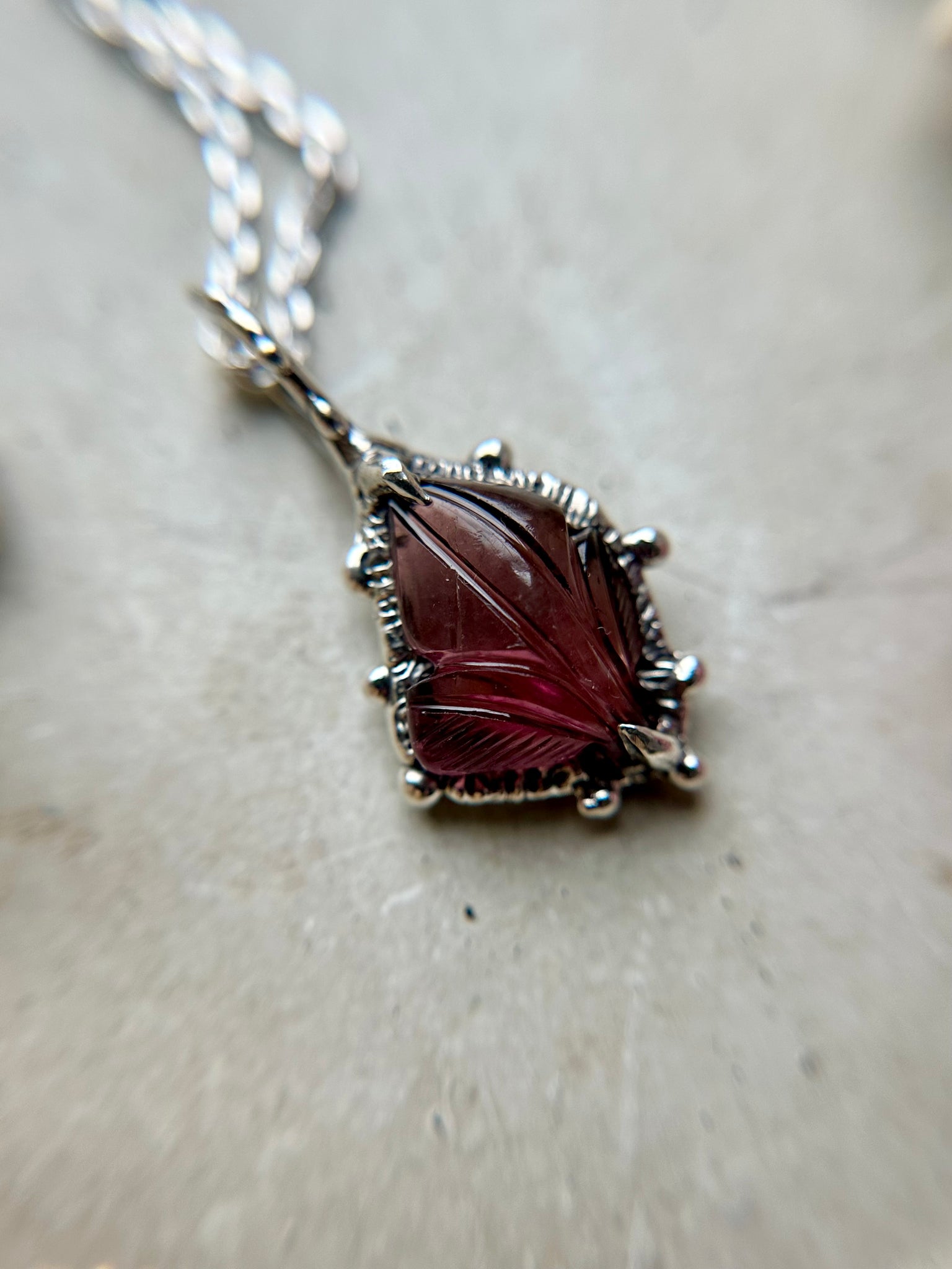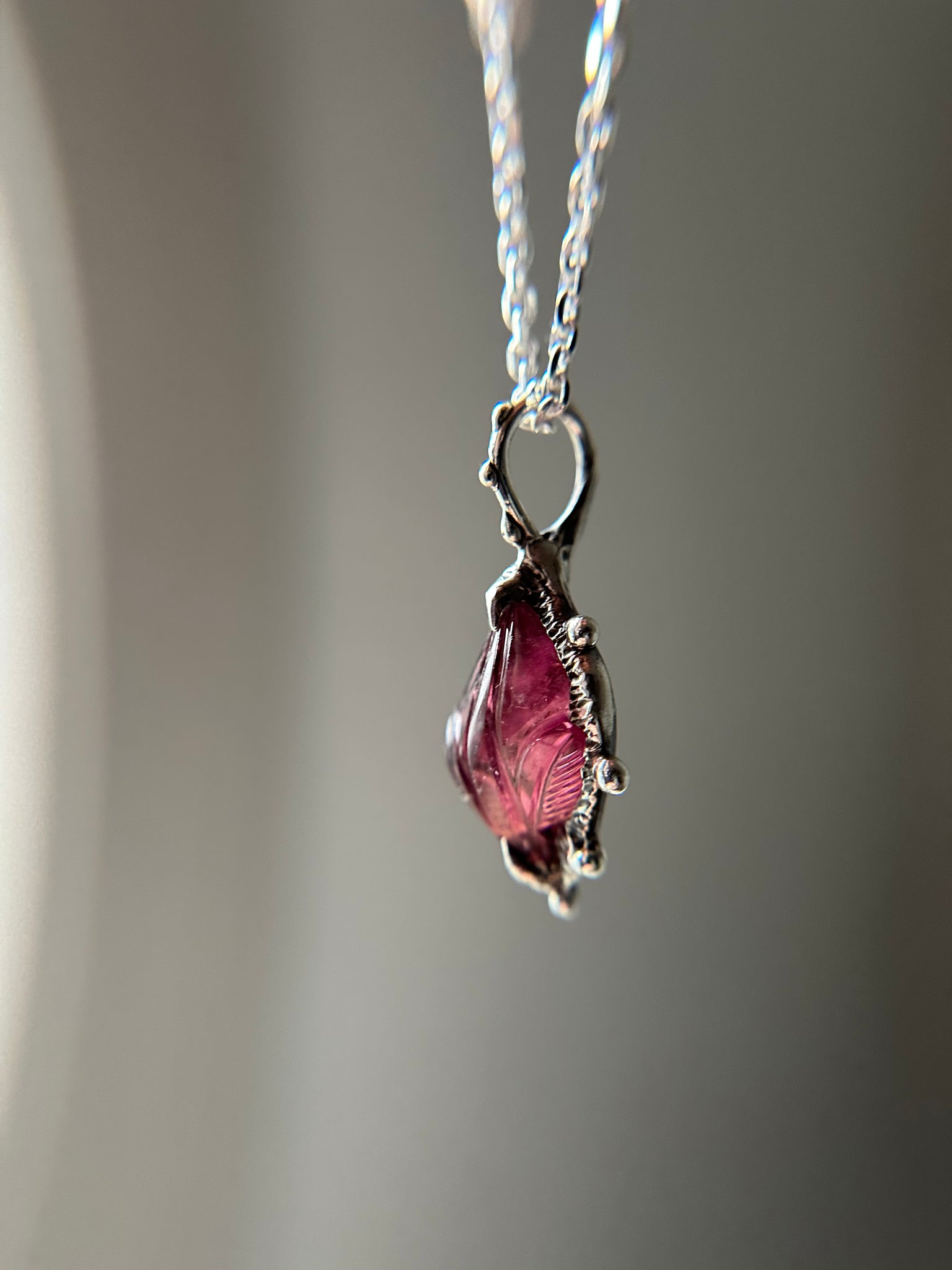 Dainty Pink Carved Tourmaline Sterling Silver Necklace