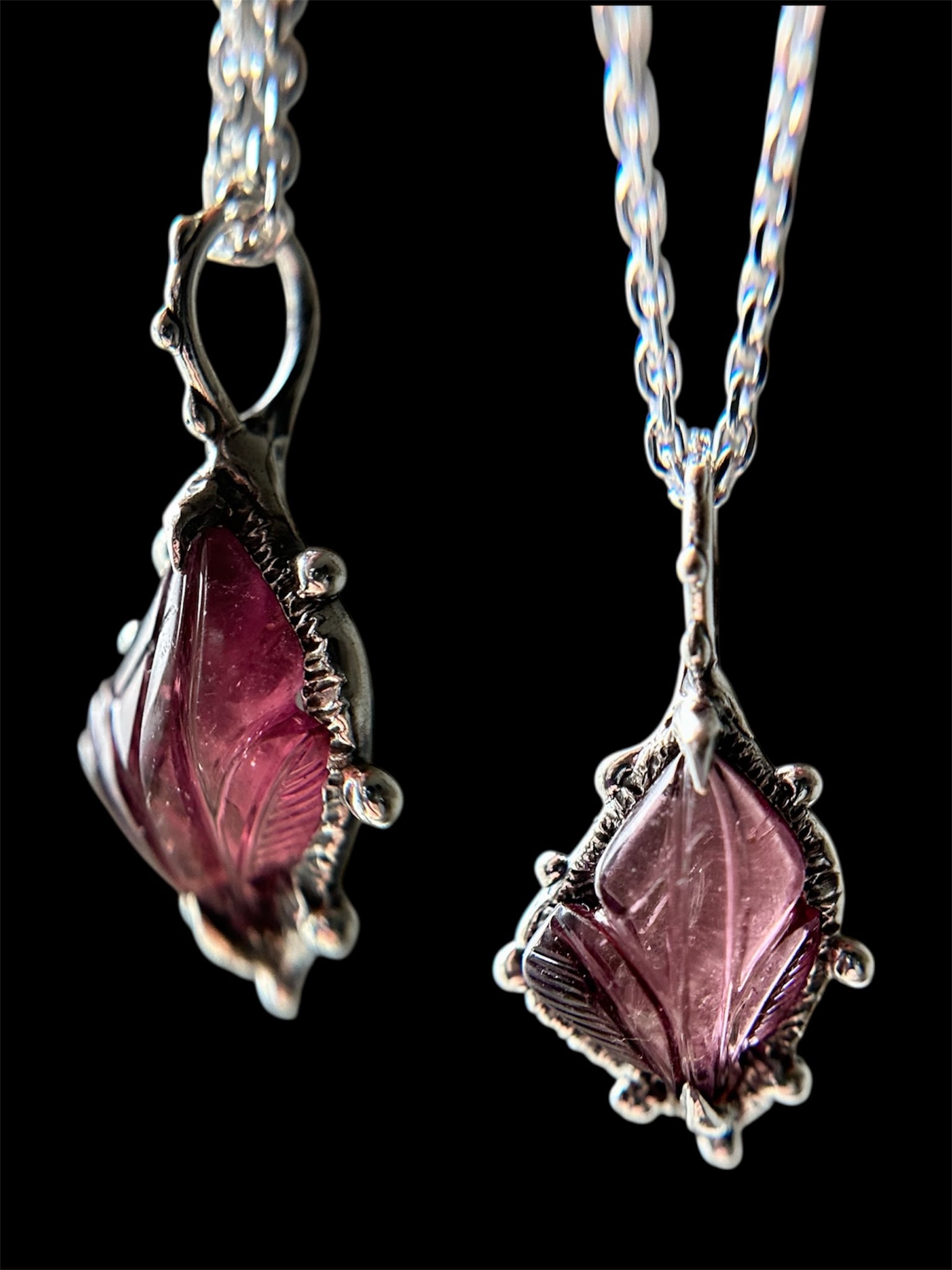 This dainty, hand-carved tourmaline necklace brings together delicate design and true craftsmanship. The natural tourmaline is set in solid sterling silver, which has been hand-carved in wax and cast using the traditional lost wax casting technique. The pendant measures just over 1 inch long, making it the perfect subtle yet captivating piece for everyday wear.
