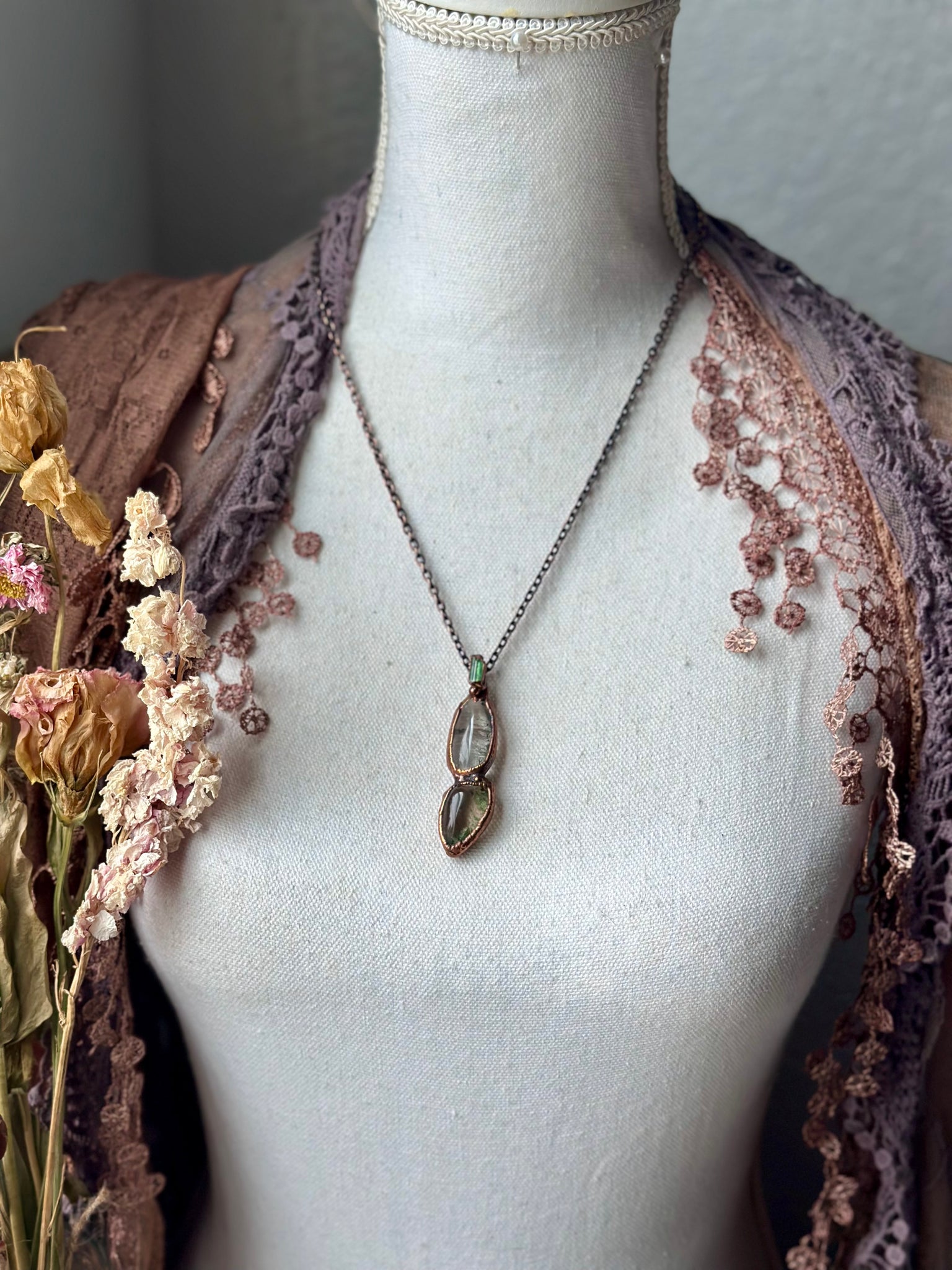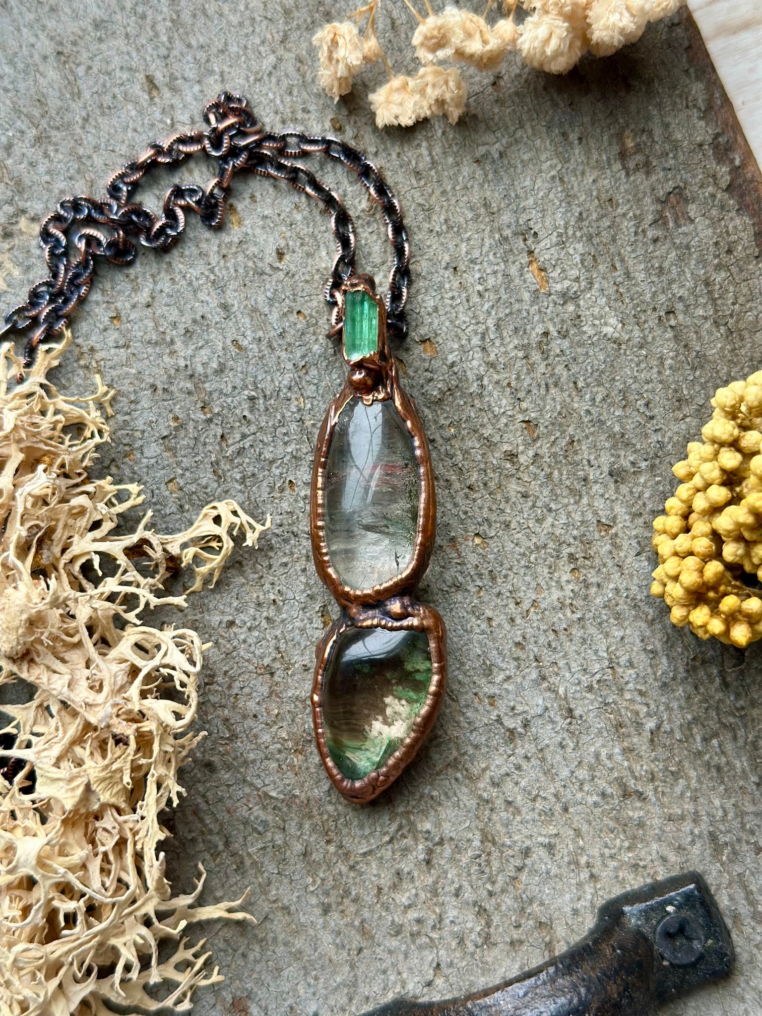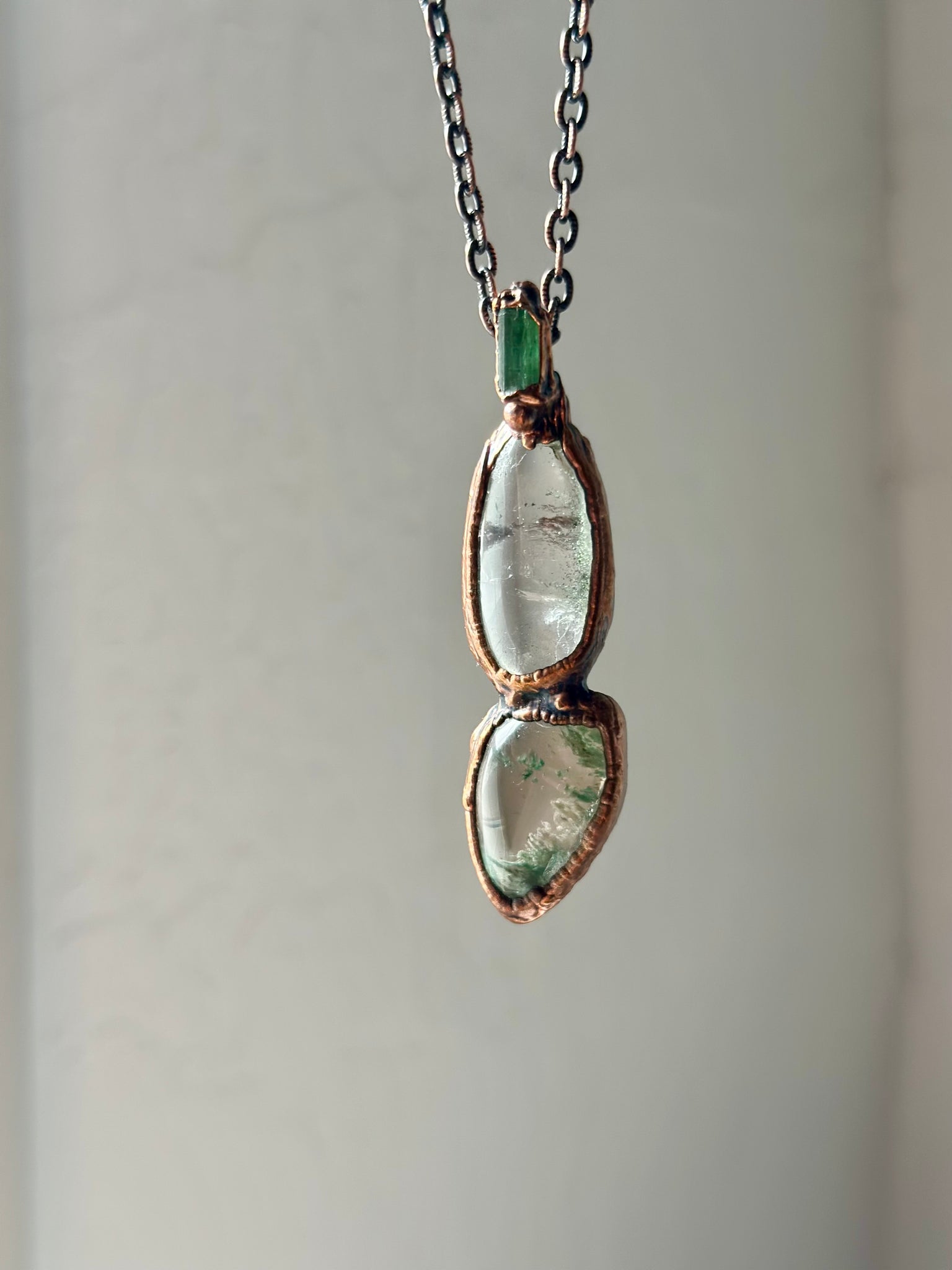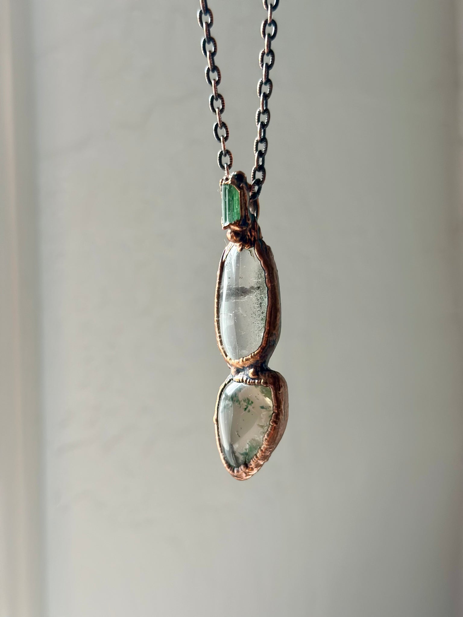 Elevate your collection with this stunning Garden Quartz & Green Tourmaline Copper Necklace. The pendant, measuring 2.5 inches long, features a beautifully natural Garden Quartz adorned with vibrant Green Tourmaline accents, creating a harmonious blend of earthy energy and refined elegance. Handcrafted with care, the pendant hangs from an 18-inch copper chain, offering a warm, rustic glow that complements the unique stones. Perfect for layering or wearing alone as a statement piece, this necklace channels grounding energy while making a bold, artistic statement.