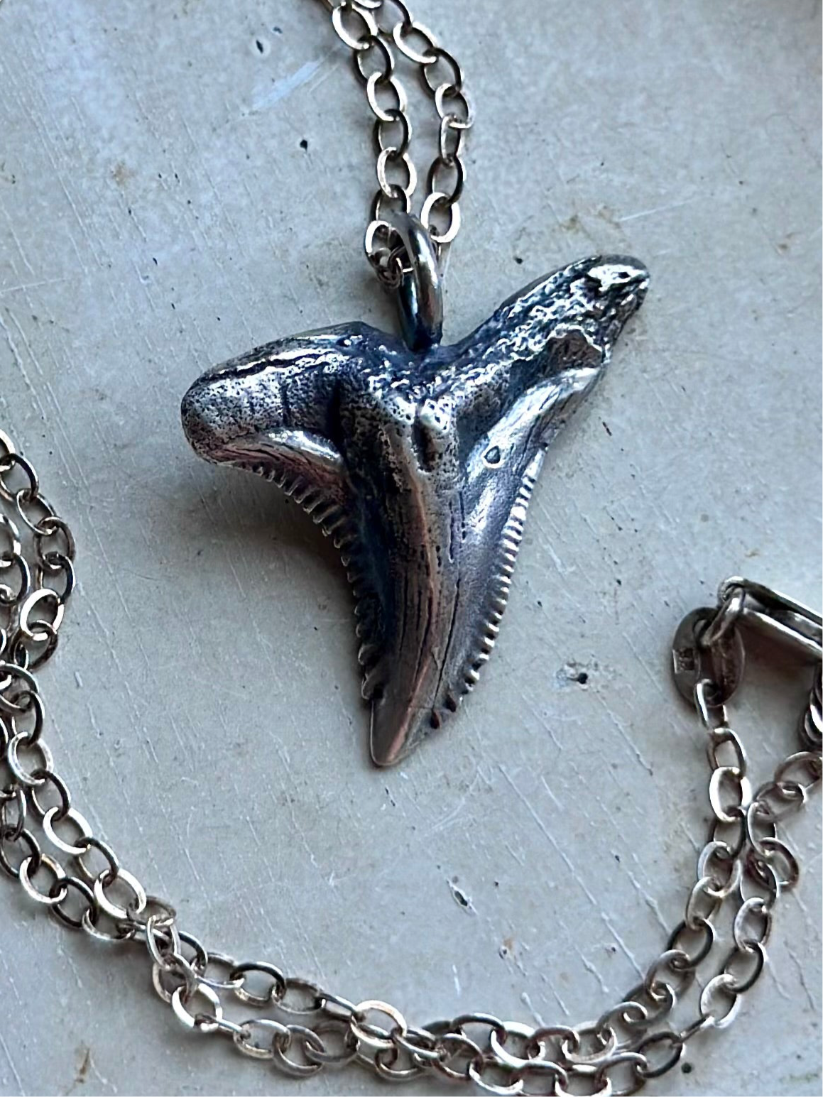 This striking Hemipristis shark tooth pendant is cast in solid sterling silver using the lost wax casting technique, capturing the fossil's rugged detail. Measuring 1.25 inches with the bail, the pendant hangs from an 18-inch long chain. Customize your look by selecting your preferred chain option from the menu below. Perfect for those who appreciate bold, nature-inspired jewelry with a touch of history.