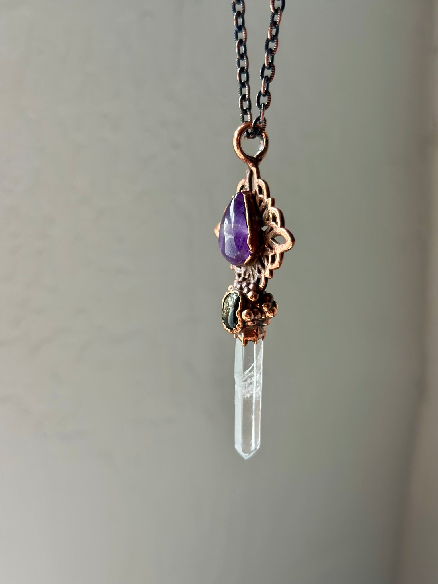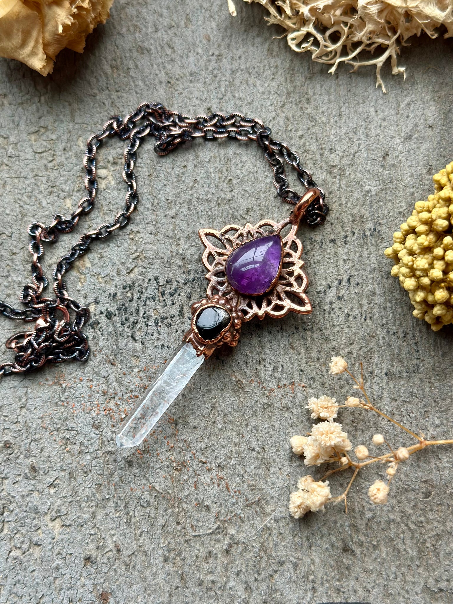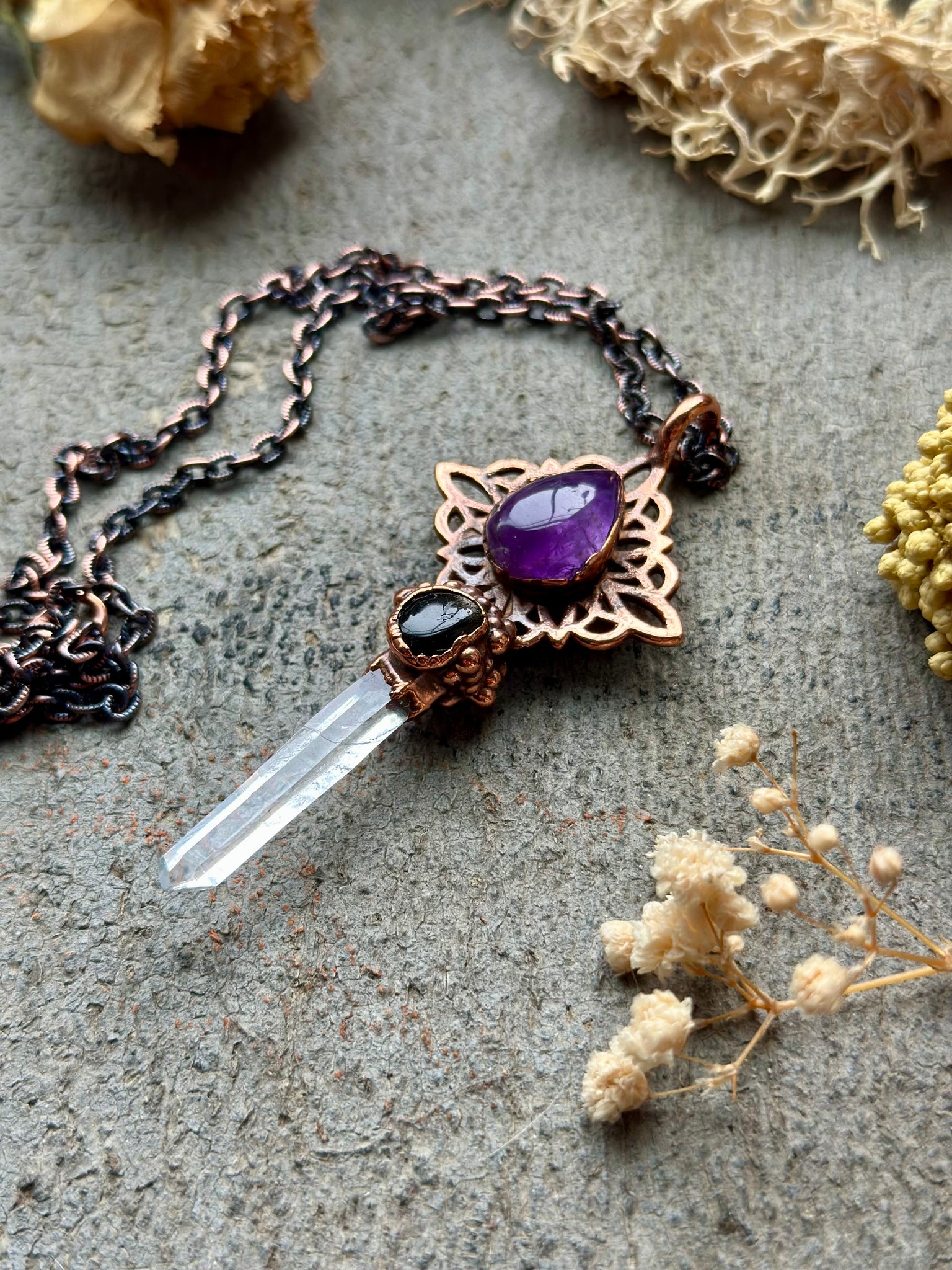 This mandala-inspired copper necklace features a striking trio of Clear Quartz, Amethyst, and Obsidian, beautifully balanced for both visual impact and energetic harmony. Each crystal is set using the electroforming technique, giving the copper a unique, organic texture that wraps naturally around the stones.