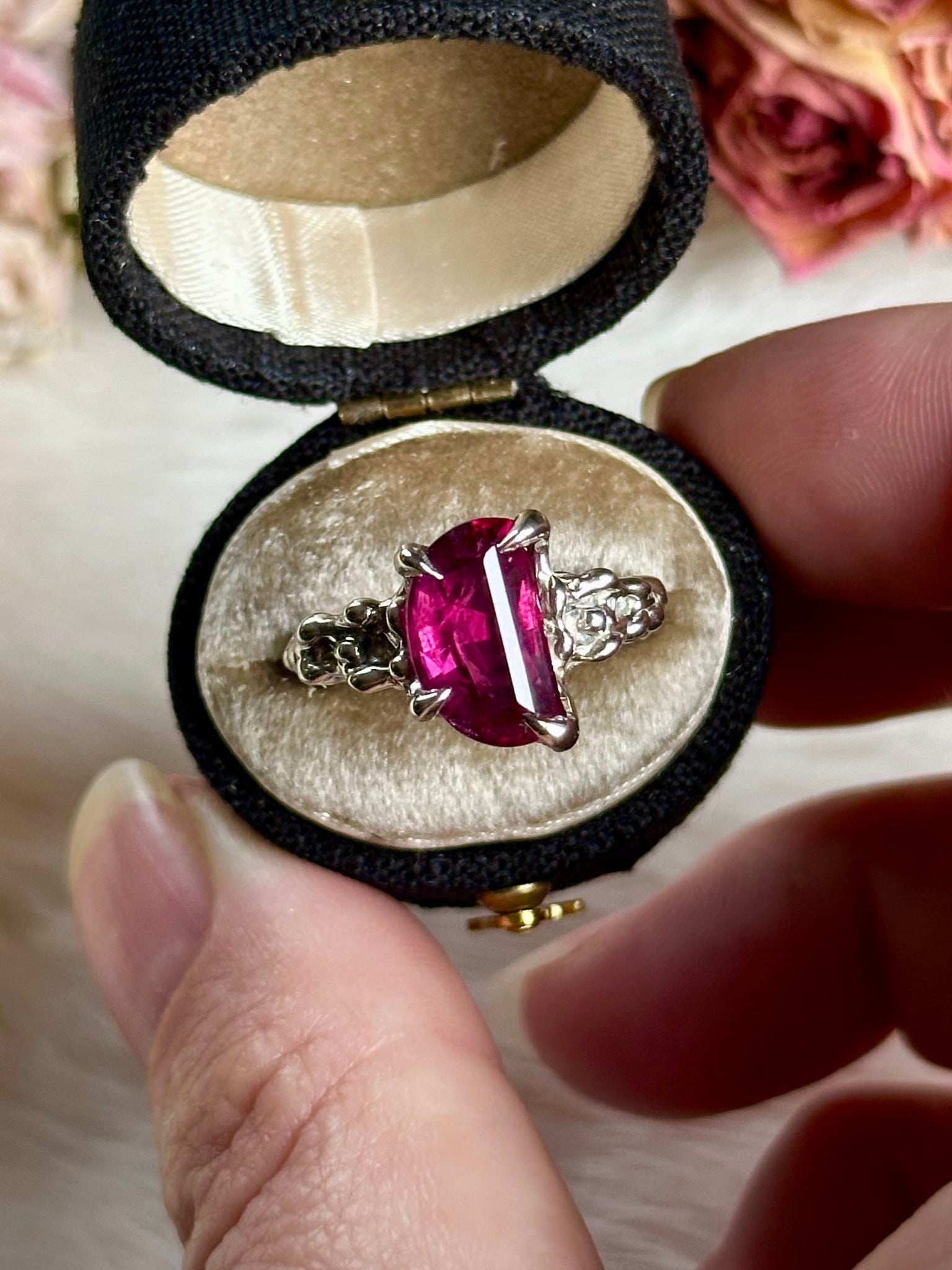 This ring features a 3.2ct pink rubellite tourmaline, cut in a dreamy moon shape that glows with vivid magenta tones. Its celestial form is set into an organic, hand-carved design that flows around the gem, enhancing both its brilliance and unique character. Cast in your choice of 14k or 18k solid gold, the piece is crafted to embody both artistry and timeless elegance.