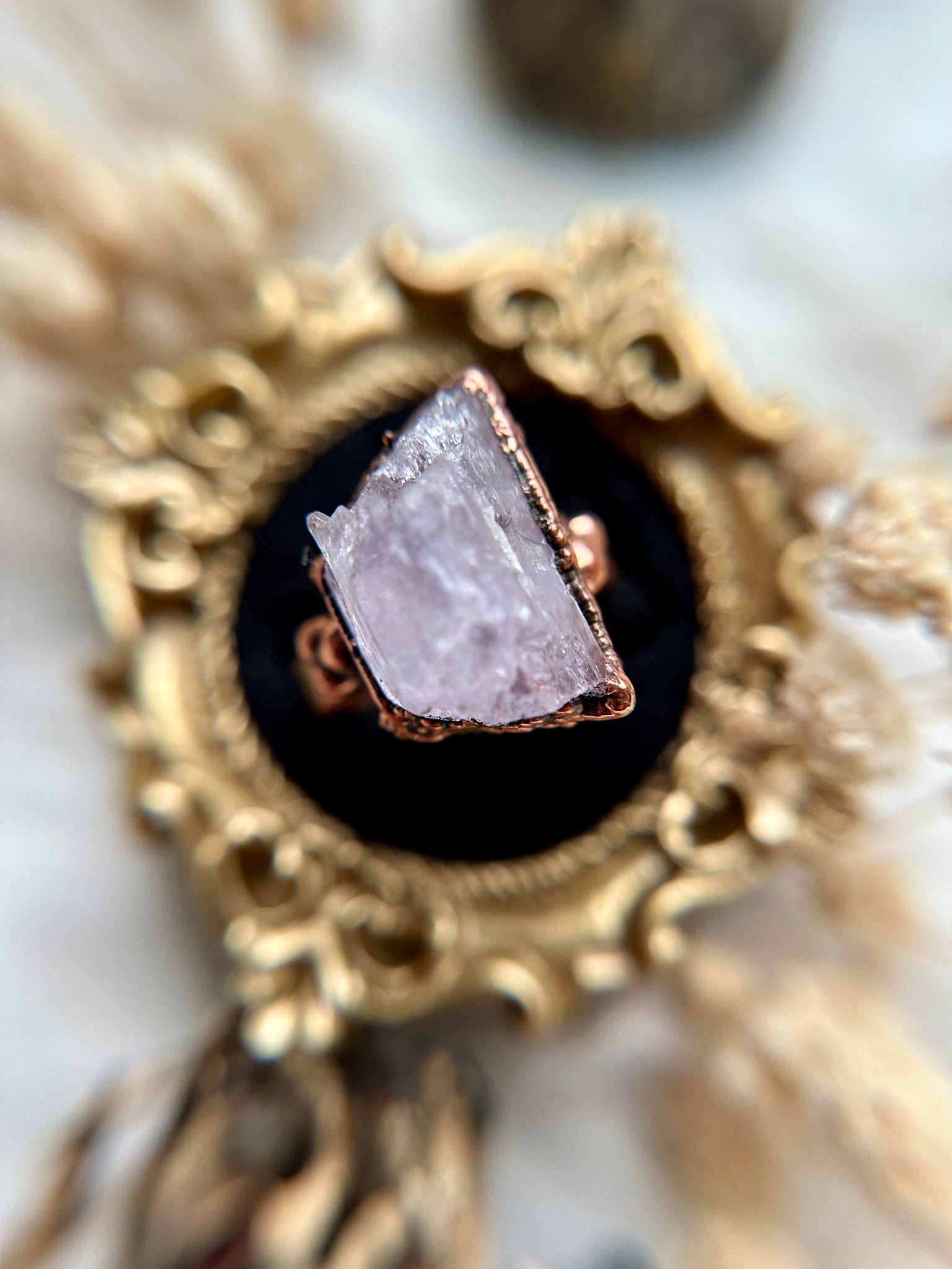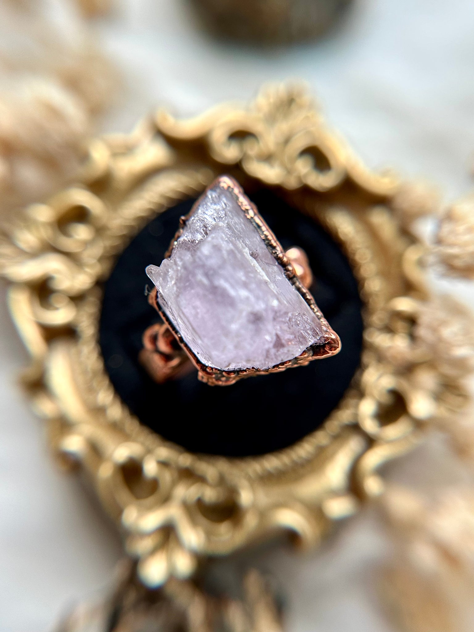 Experience the pure energy of love with this beautifully tender, size 6.5 ring. It features a genuine, raw Pink Kunzite crystal, a "Stone of Emotion" known for its soft, beautiful pink-to-lilac hue and ability to open the heart chakra. The Kunzite’s unpolished, natural form is nestled within a substantial, protective cradle of pure copper, formed using the electroforming technique. This process creates a uniquely rugged texture that grounds the delicate, high-vibrational energy of the Kunzite, making for a truly soulful and enchanting piece of wearable art.