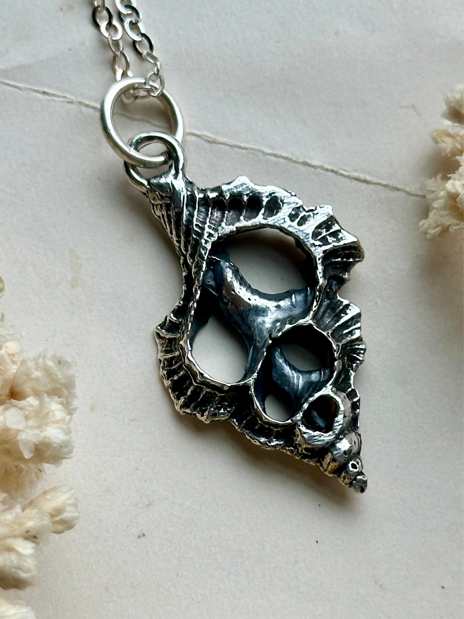 This elegant hand-casted sea shell slice pendant, crafted using the lost wax casting technique, is set in sterling silver and hangs gracefully from a 18 inch chain. The unique pendant captures the natural beauty of the sea, making it a perfect, timeless piece for any ocean lover.