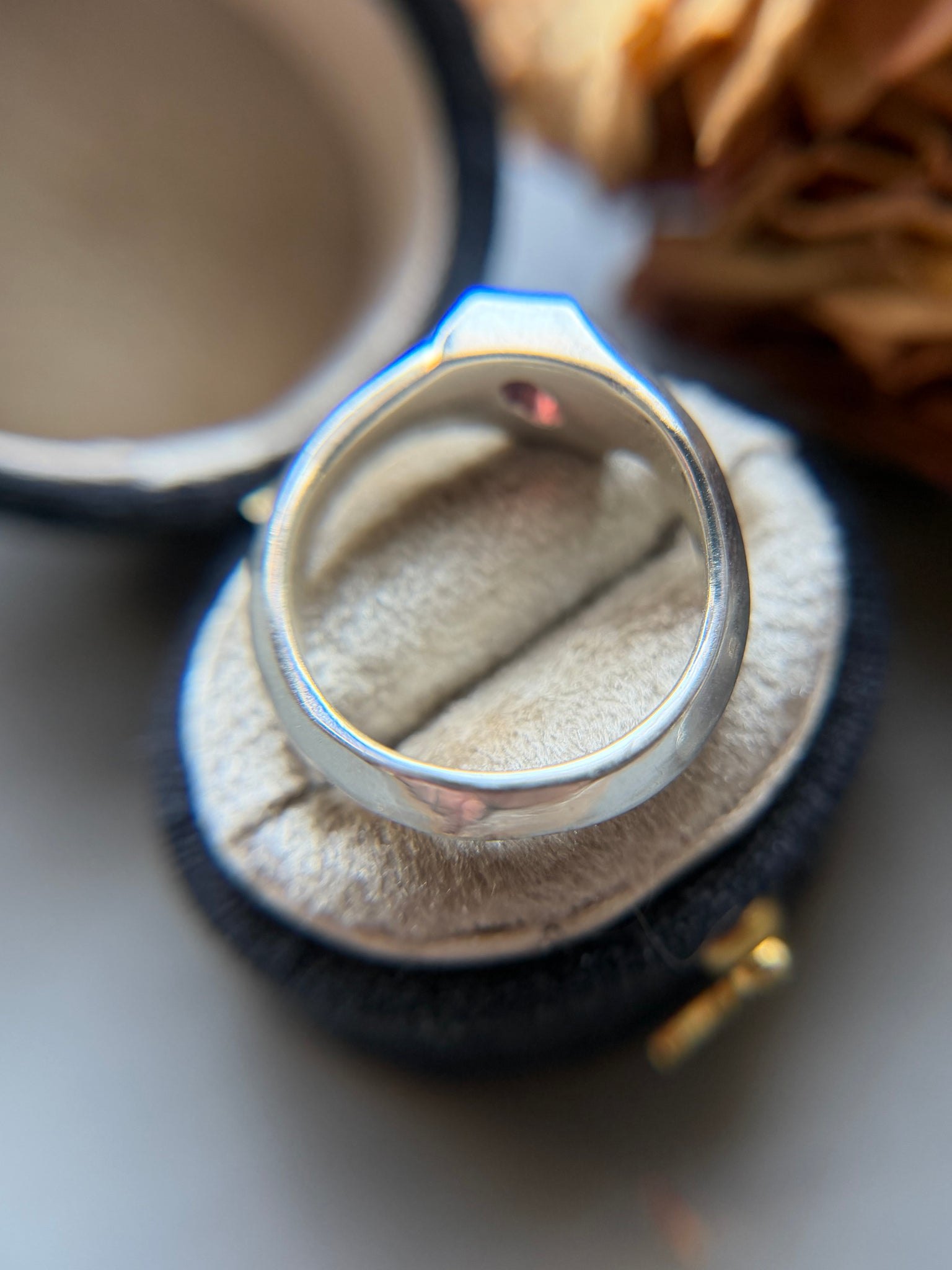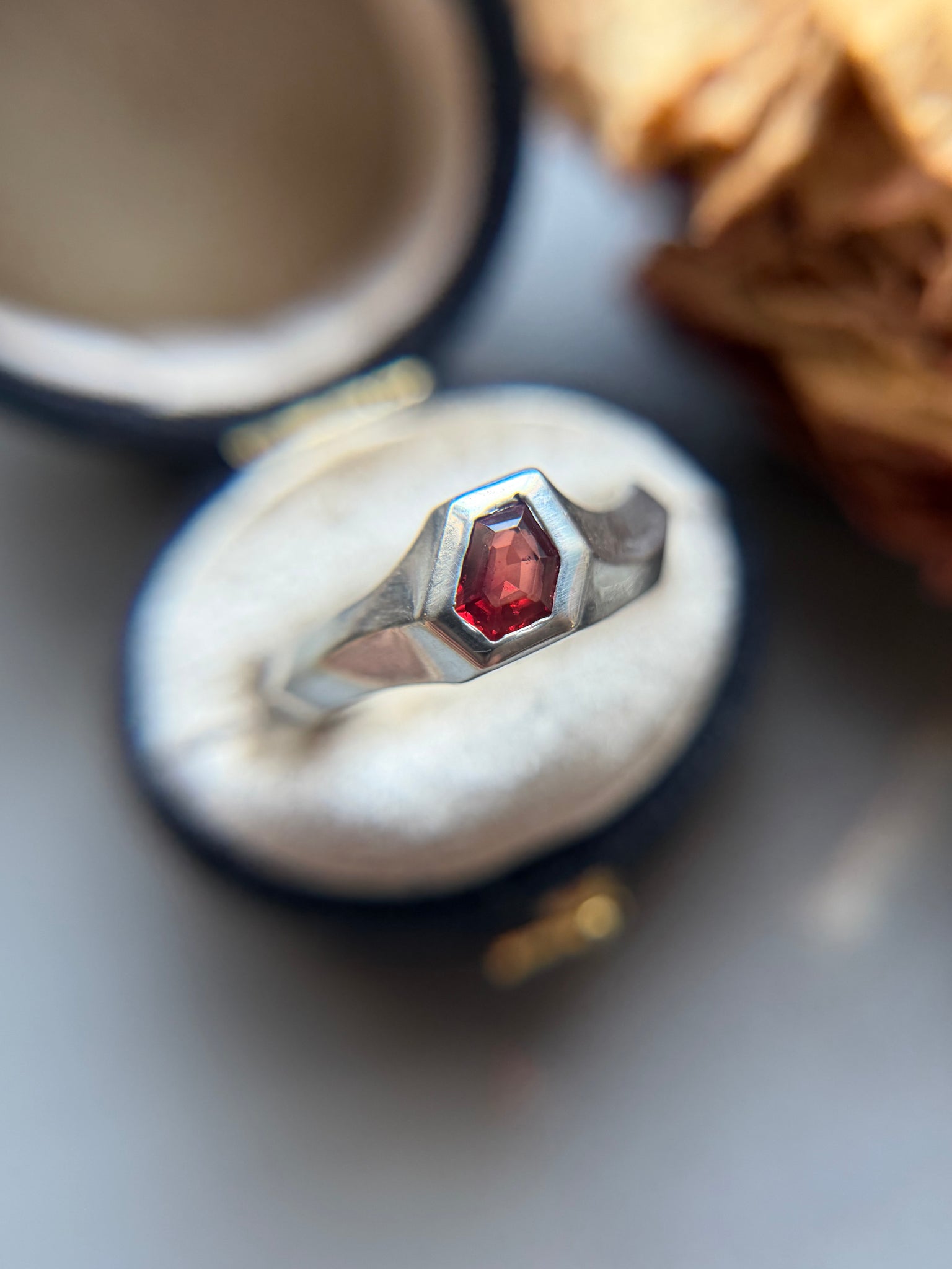 The ring is a size 5.75 and was hand-carved in wax and cast in sterling silver here in my home studio using the traditional lost wax casting technique. Each detail of the setting was carefully sculpted by hand before being transformed into metal, giving the piece its unique, artisan character.